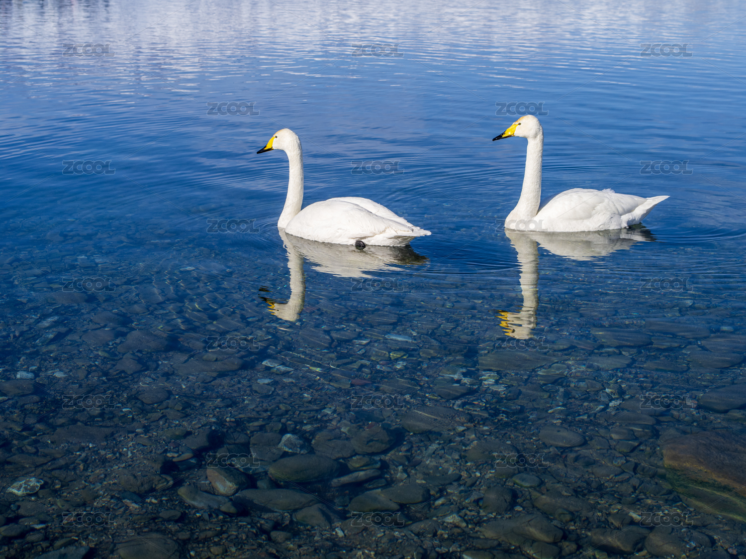 中国新疆赛里木湖辽阔湖面上成对的天鹅
