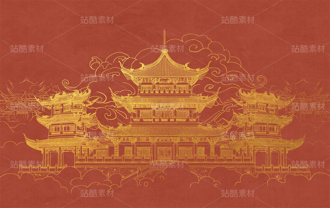 新款高清红色布纹楼阁新中式山水工装背景墙01