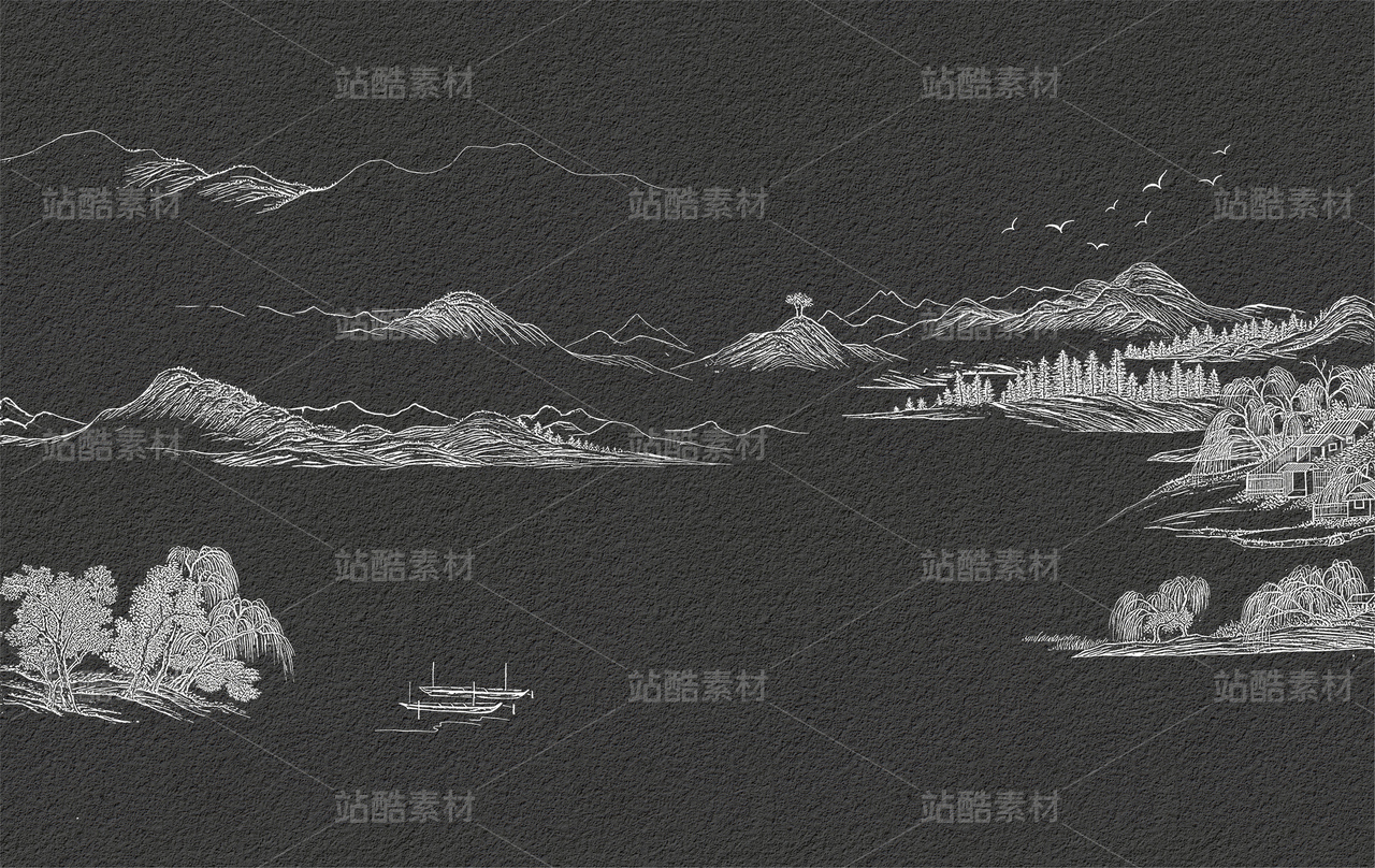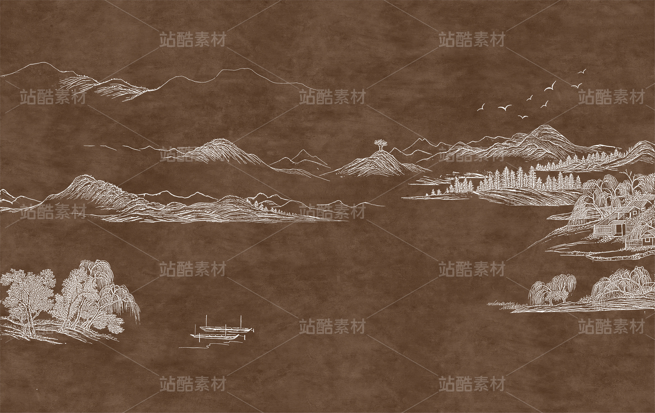新款高清红色布纹楼阁新中式山水工装背景墙04