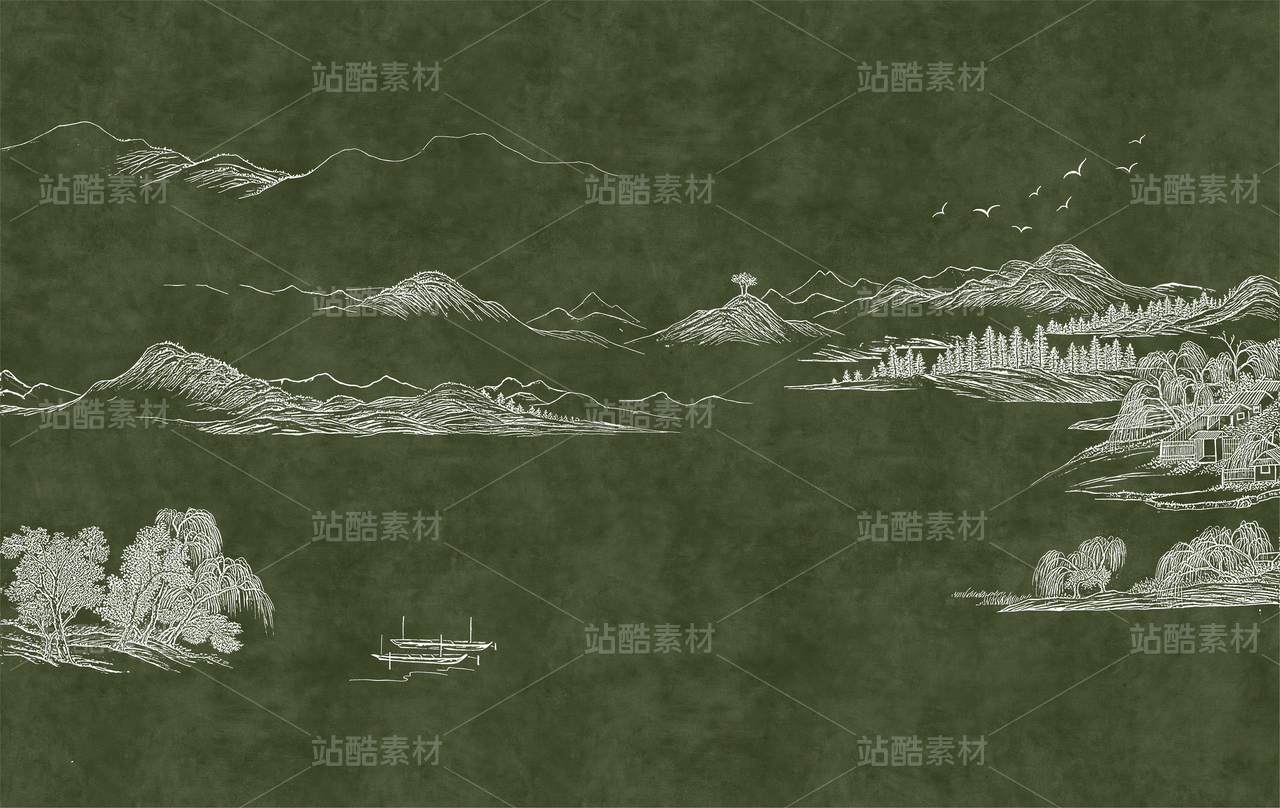 新中式国风亭台楼阁建筑工装背景墙壁画