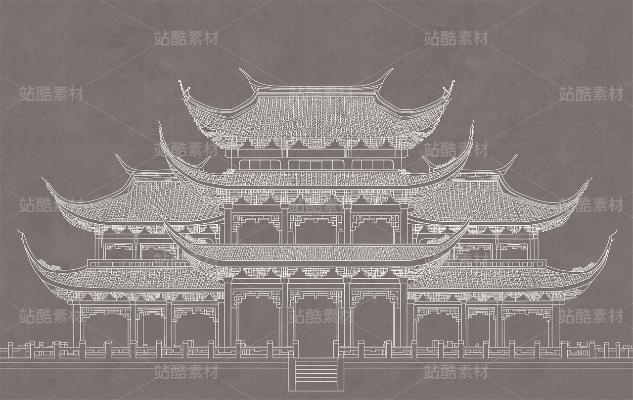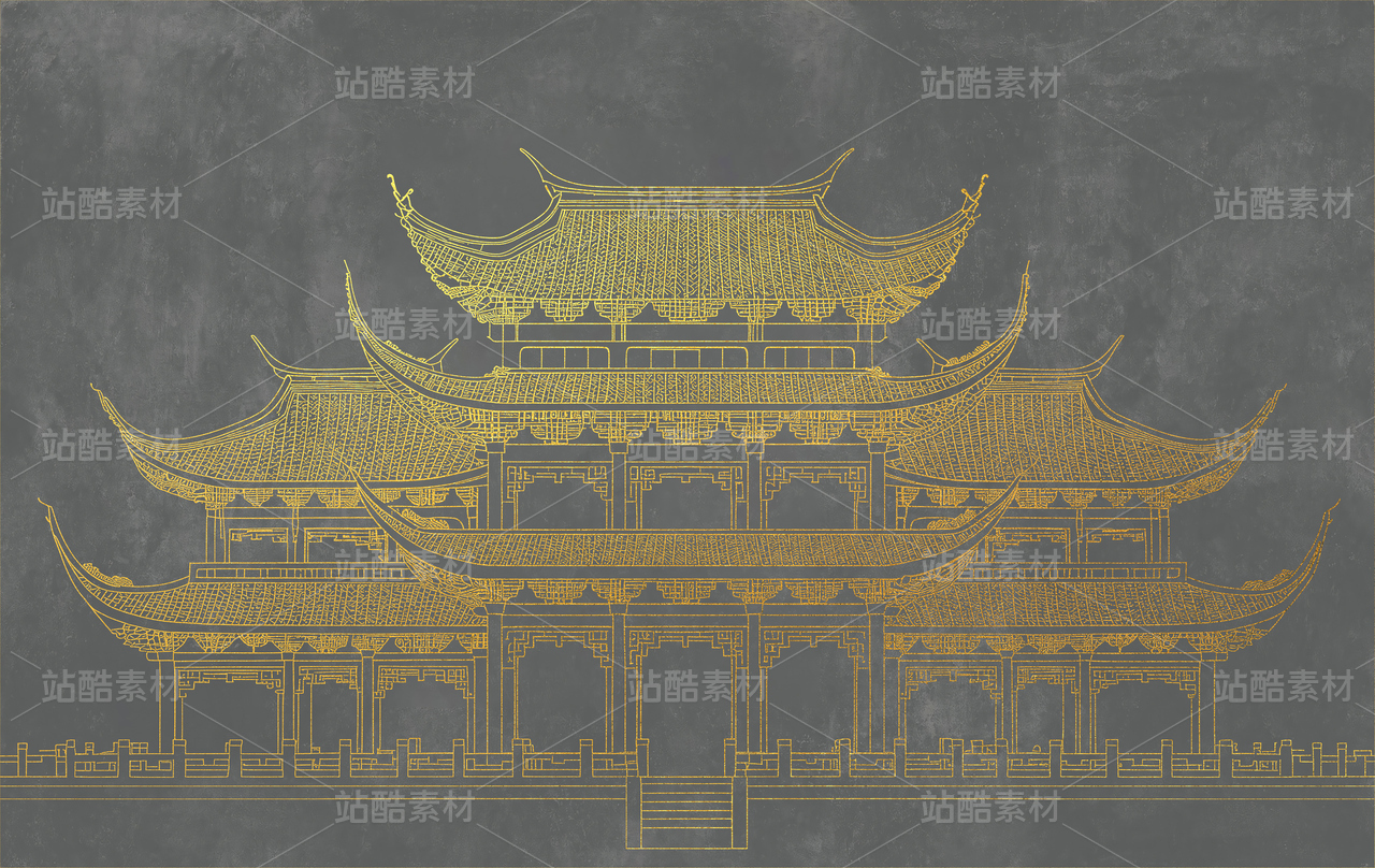 新款高清灰色肌理楼阁新中式山水工装背景墙00