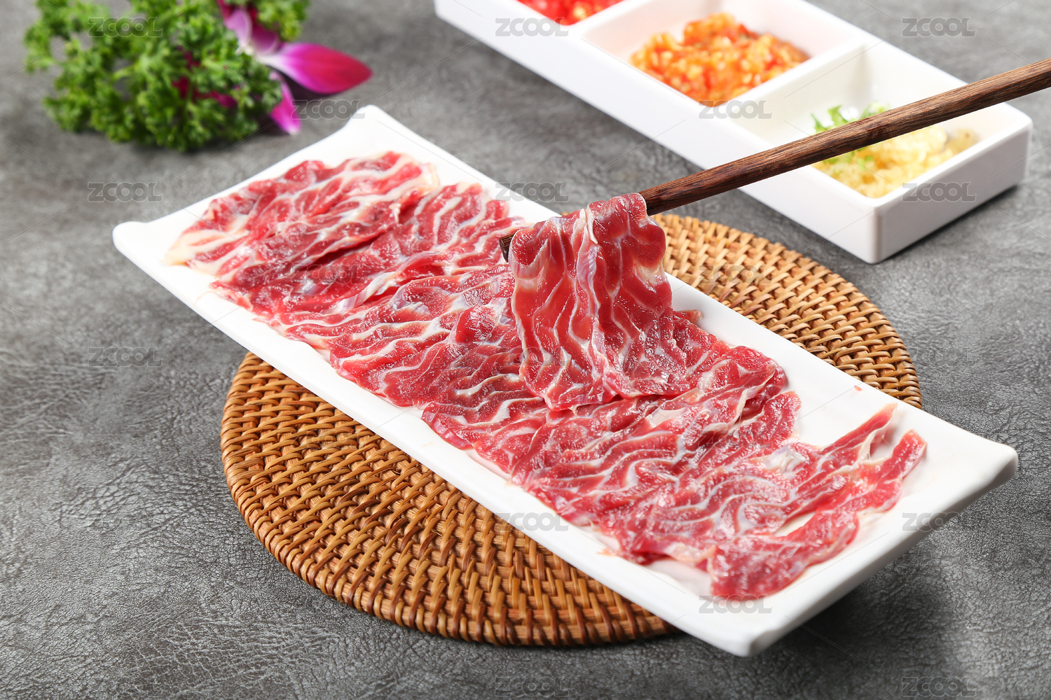 鲜切牛肉放在黑色盘子里