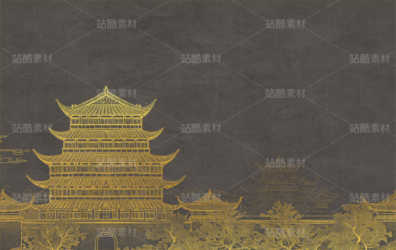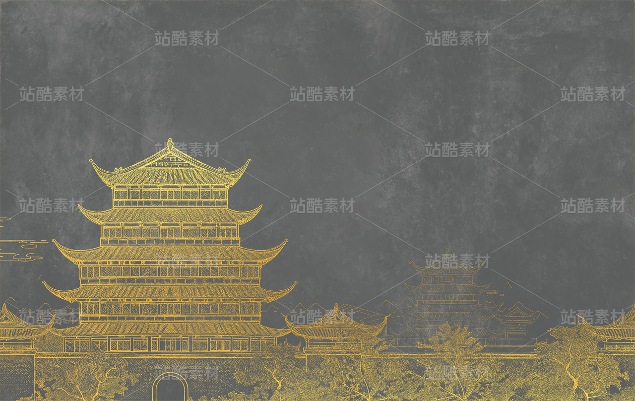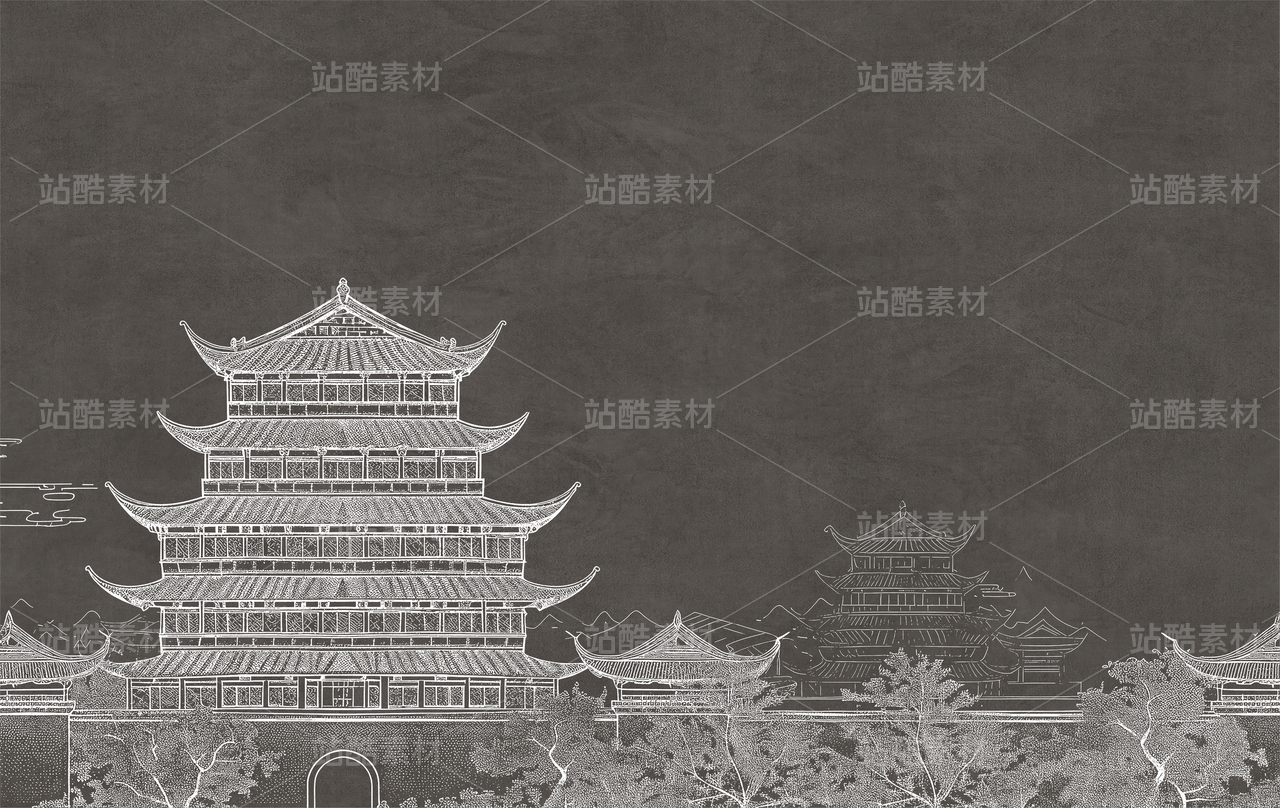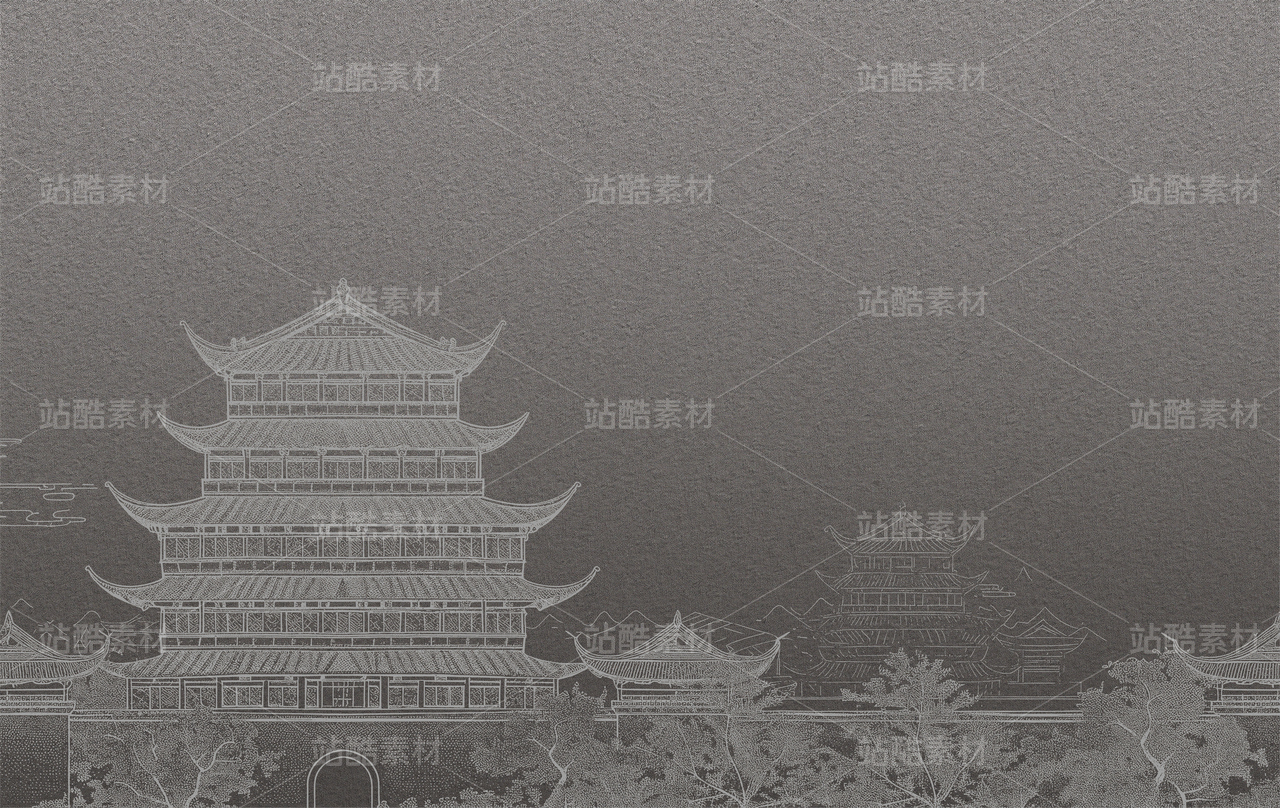 新款高清灰色肌理楼阁新中式山水工装背景墙00