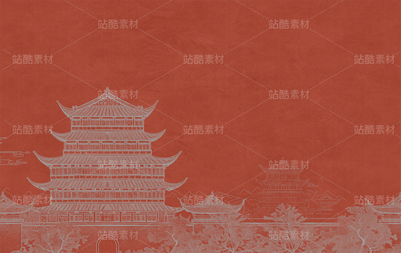 新中式国风亭台楼阁建筑工装背景墙壁画