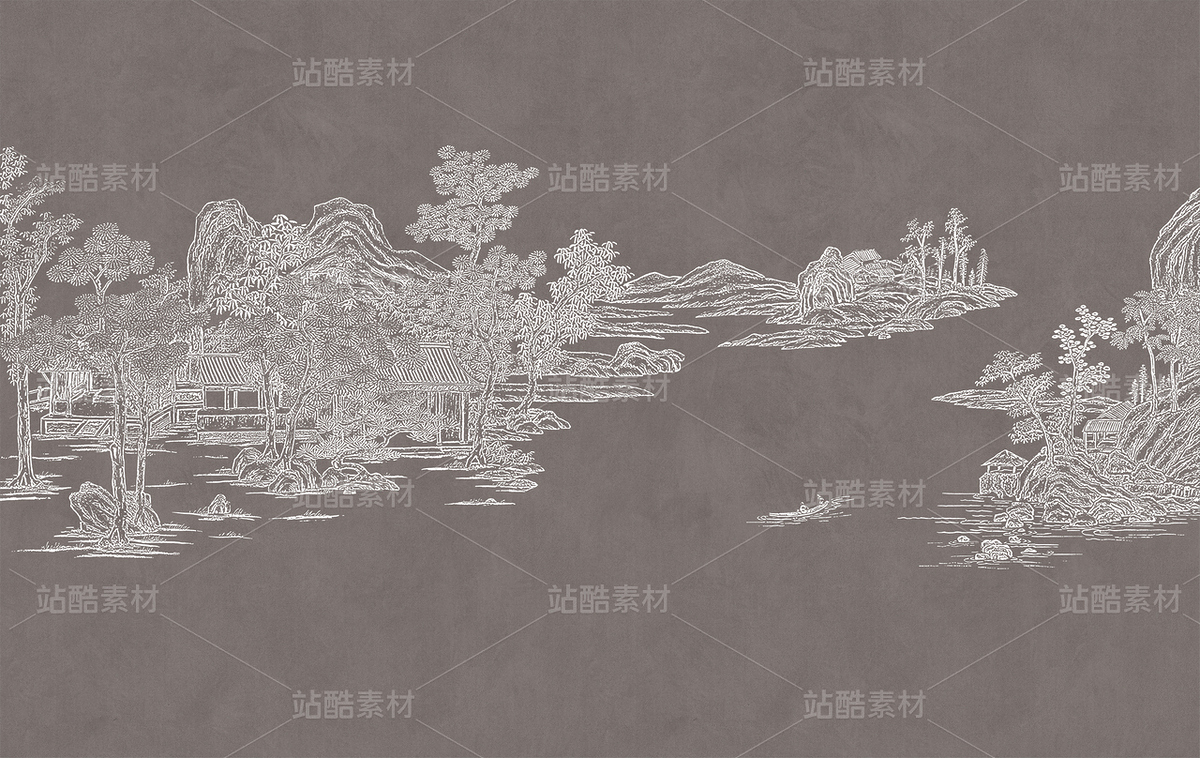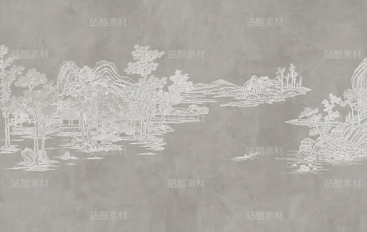 新款高清灰色肌理楼阁新中式山水工装背景墙05