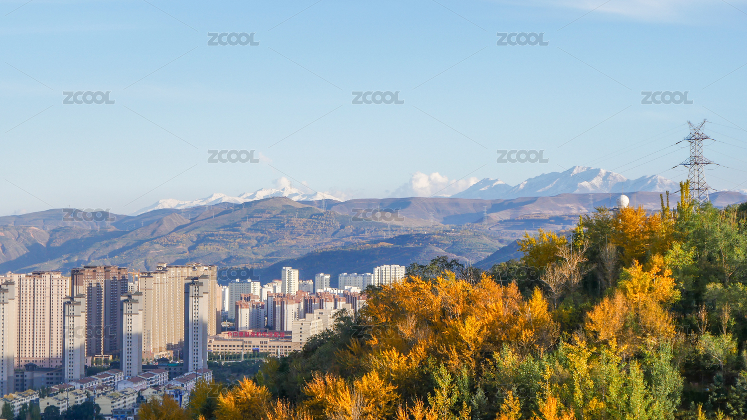 中国新疆乌鲁木齐市区的摩天大楼与天山