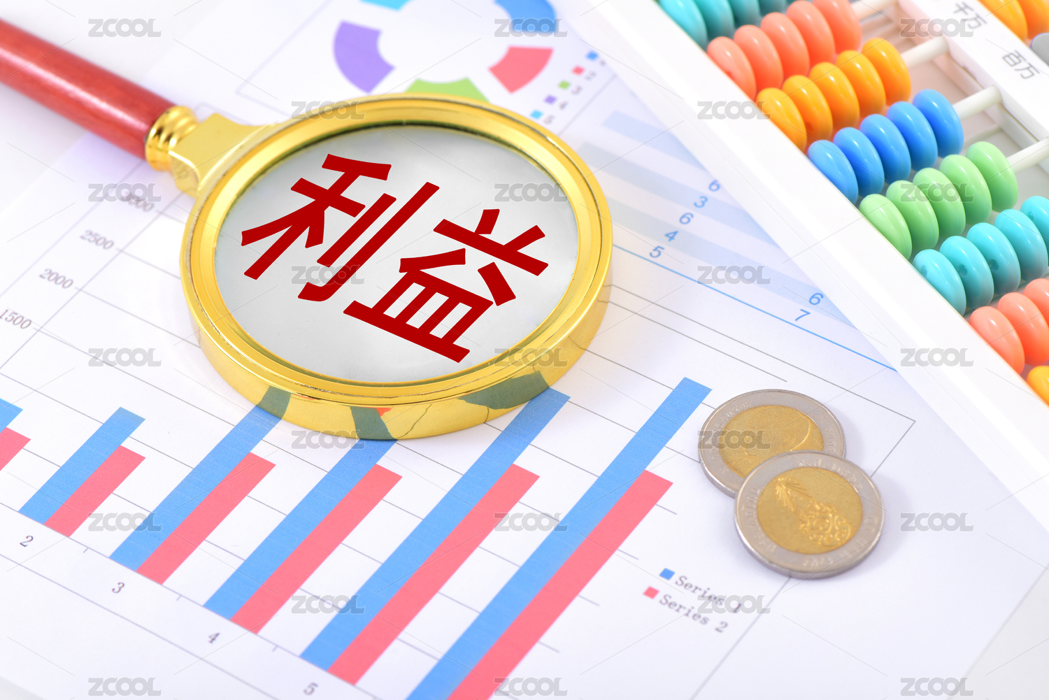 金融办公用品上的放大镜印着文字利益