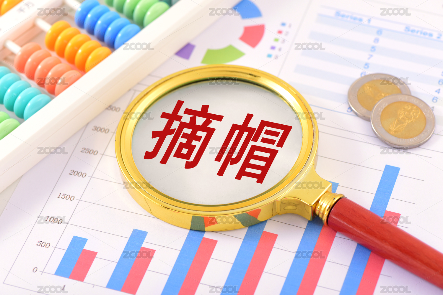 金融办公用品上的放大镜印着文字摘帽