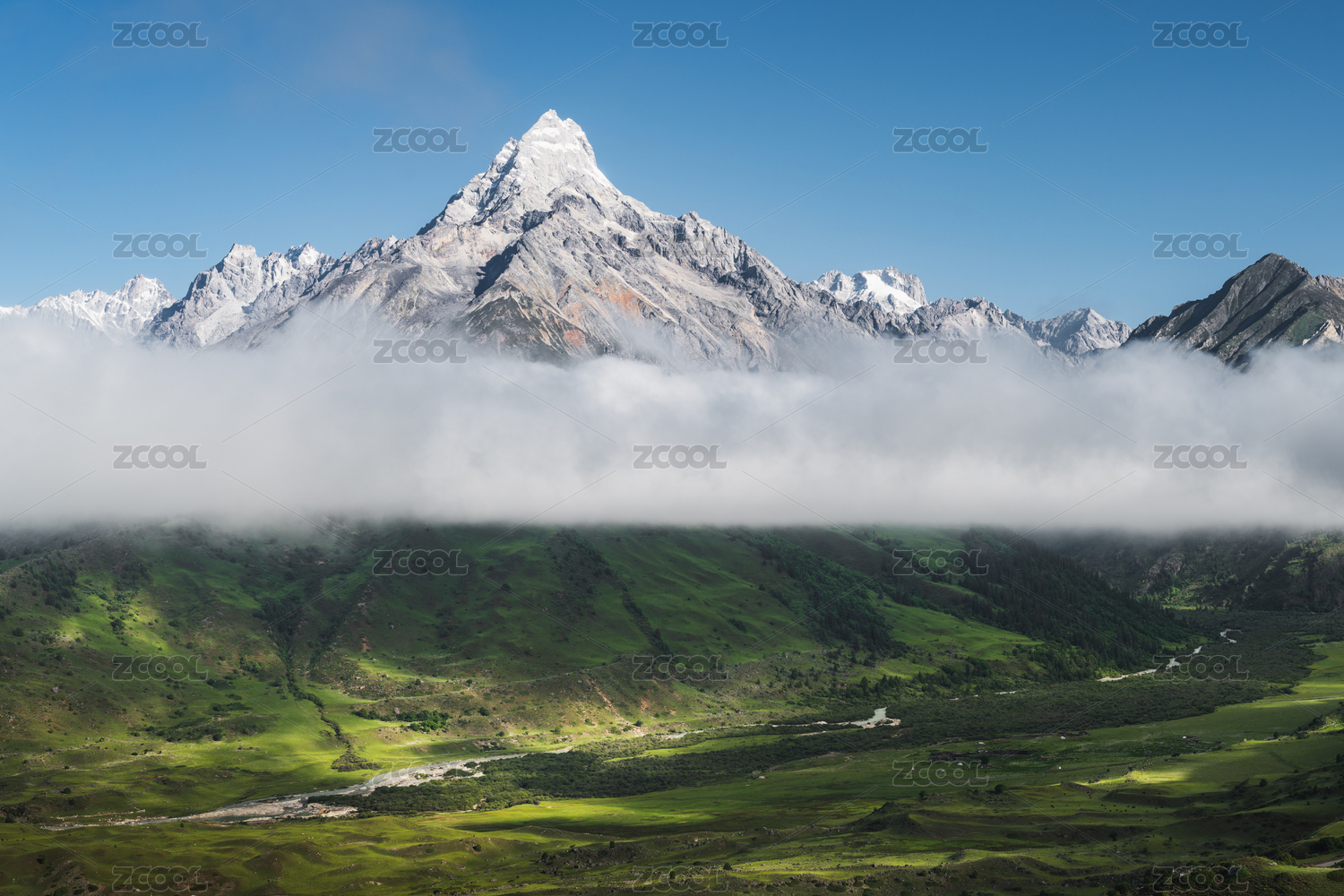 中国西藏自治区高原上云雾缭绕的雪山