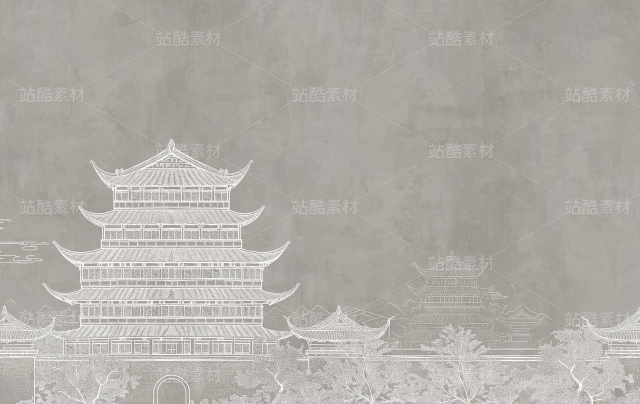 新款高清灰色微水泥亭台楼阁新中式山水工装背景墙00