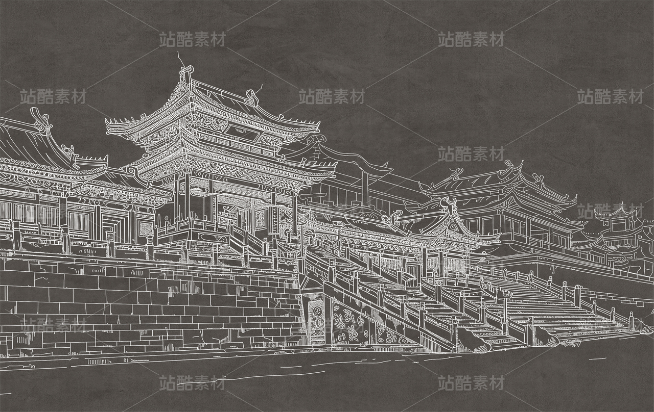 新中式国风亭台楼阁建筑工装背景墙壁画