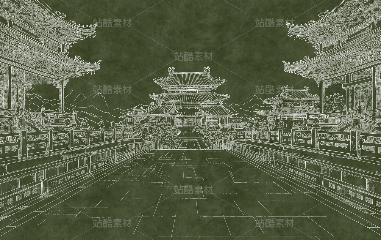 新中式国风亭台楼阁建筑工装背景墙壁画