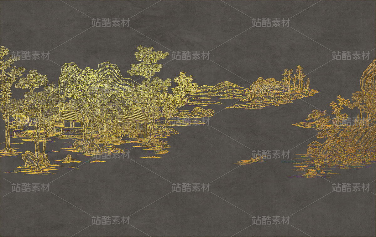 新款高清灰微水泥亭台楼阁新中式山水工装背景墙05