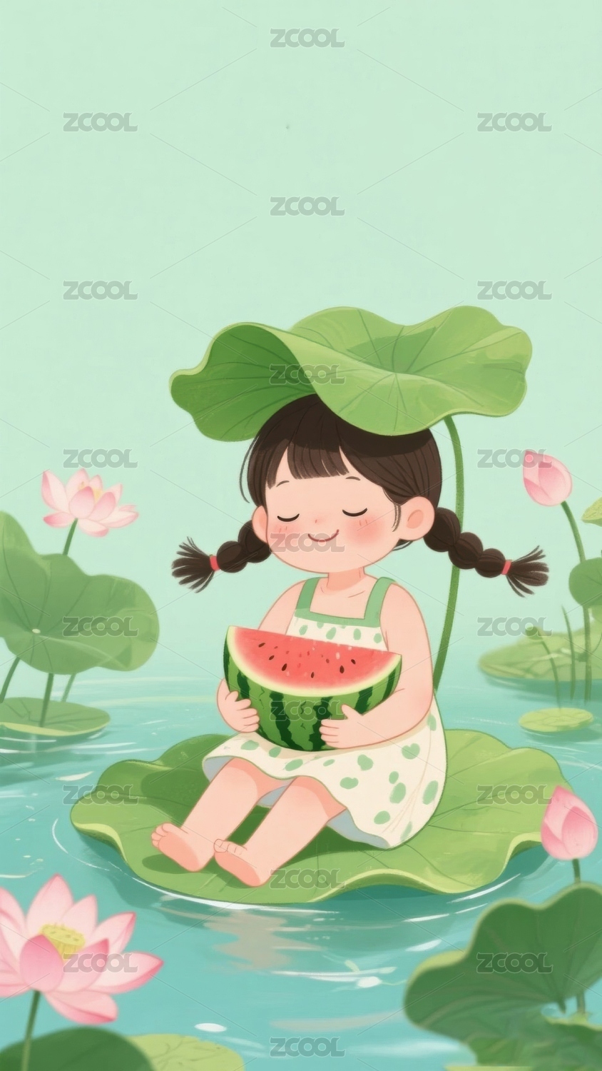 夏天躺在荷叶上吃西瓜纳凉的小女孩手绘插画