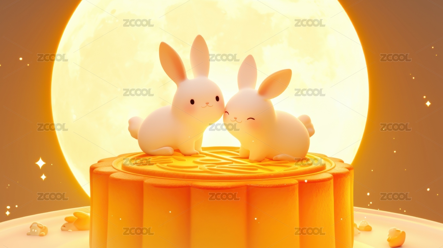 月光下的两只兔子依偎在月饼上