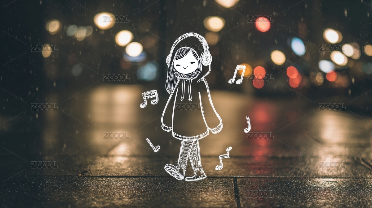 背景,梦幻,艺术,城市,户外,灯光,场景,女孩,耳机,音乐
