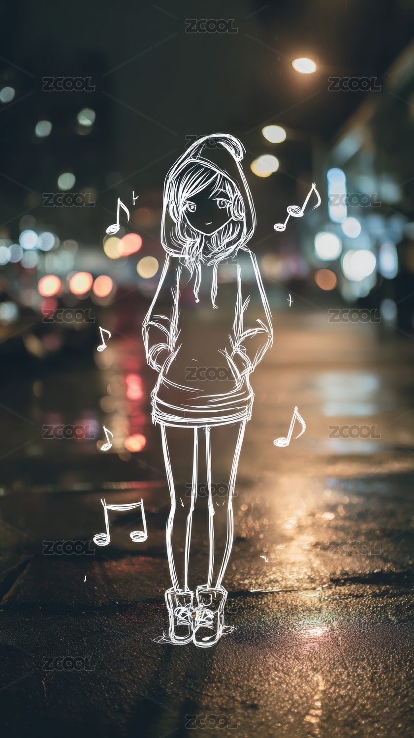 梦幻,艺术,现代,户外,灯光,场景,女孩,耳机,音乐,音符