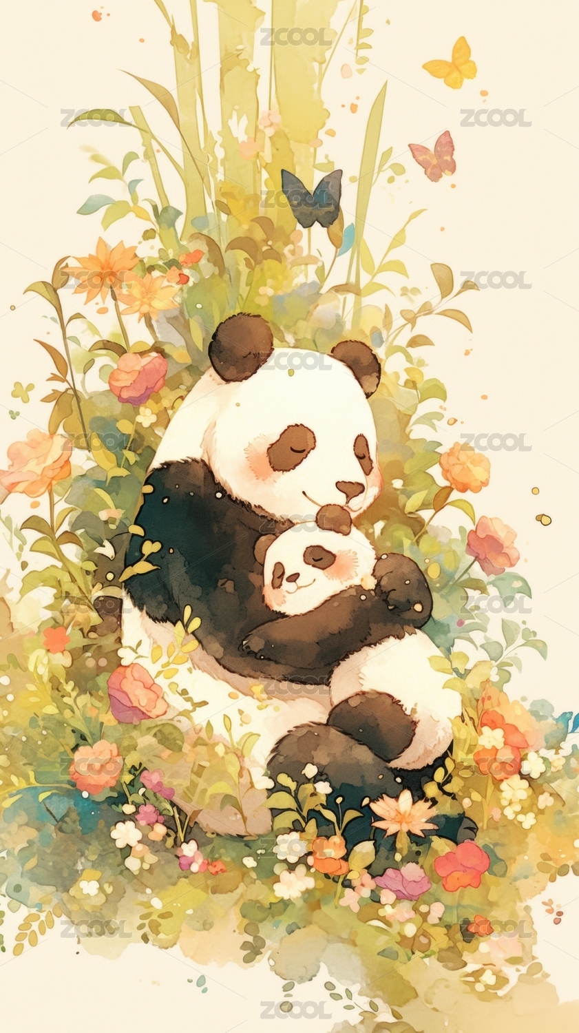 熊猫幼崽与蝴蝶在花丛中嬉戏