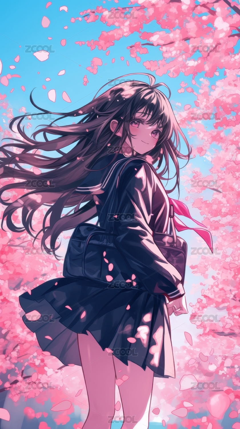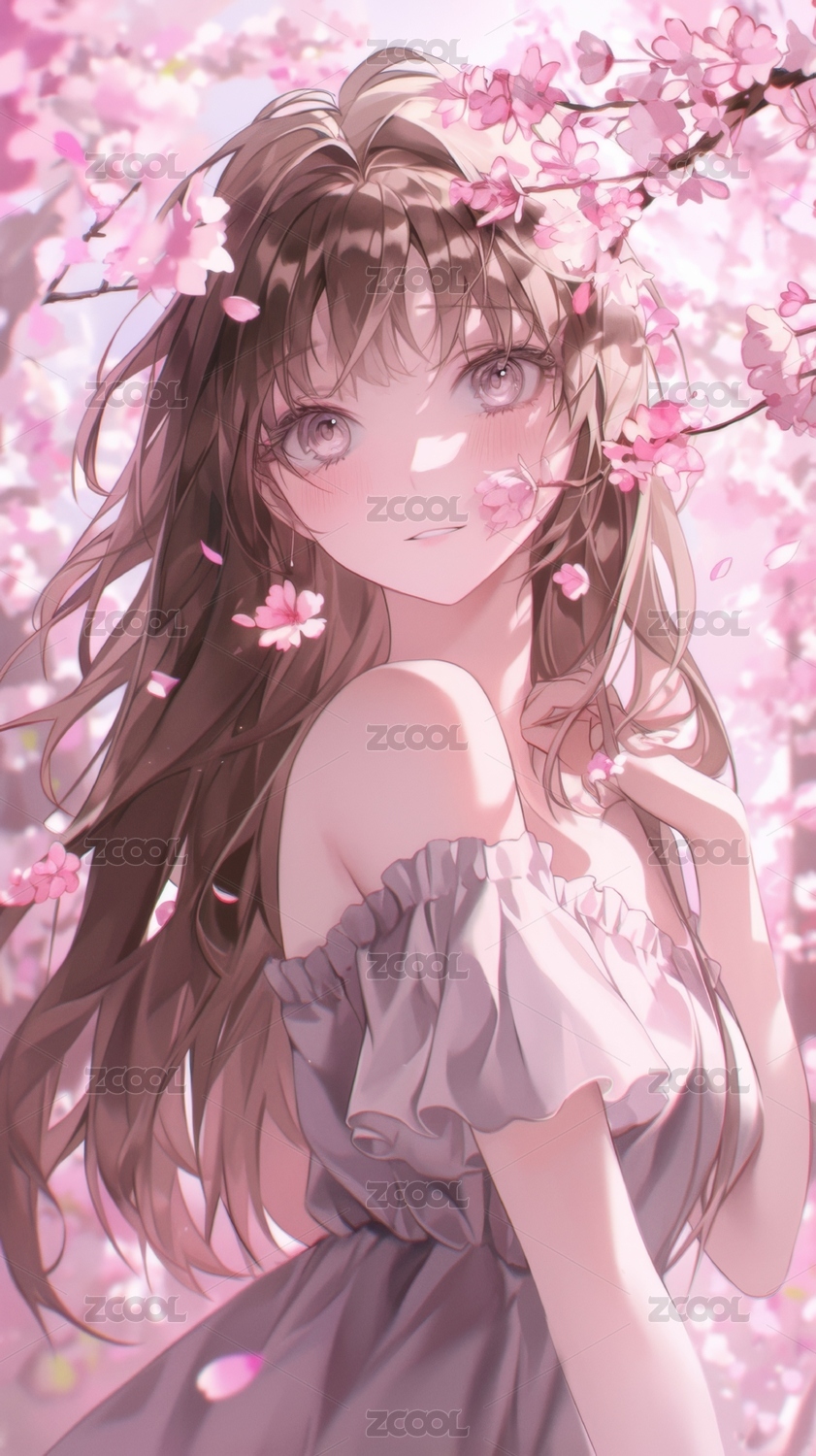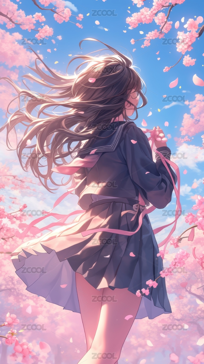 樱花树下长发少女的梦幻瞬间