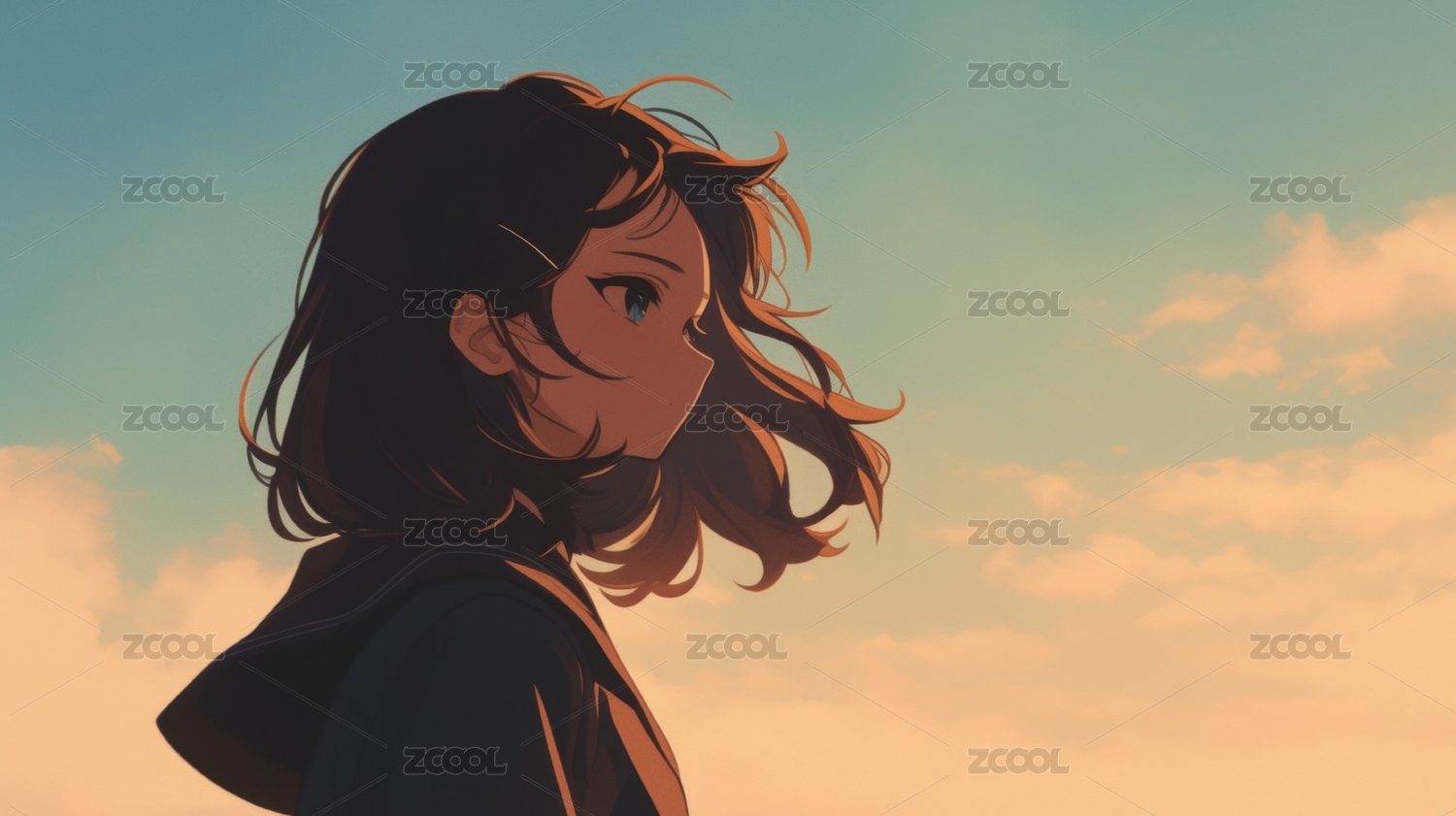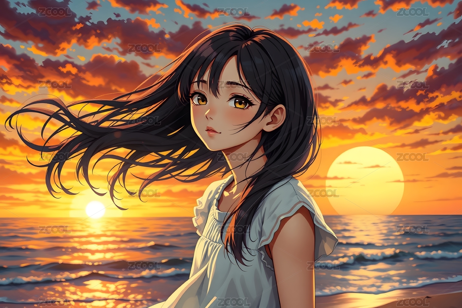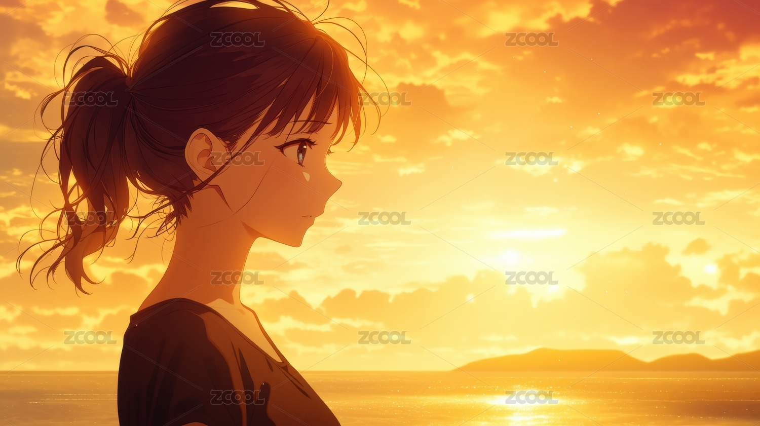 海边夕阳下的动漫少女