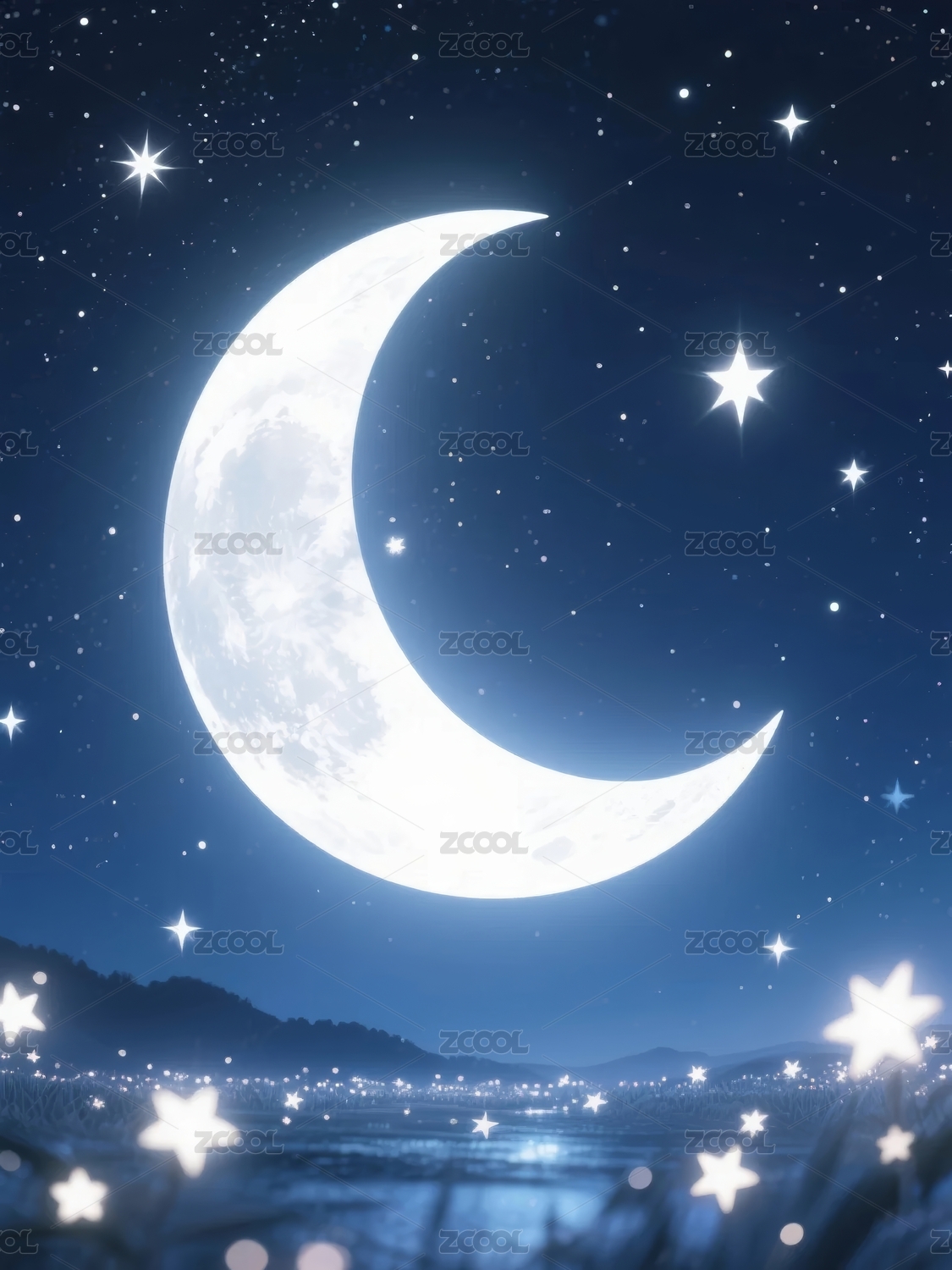 手托弯月闪耀群星夜空