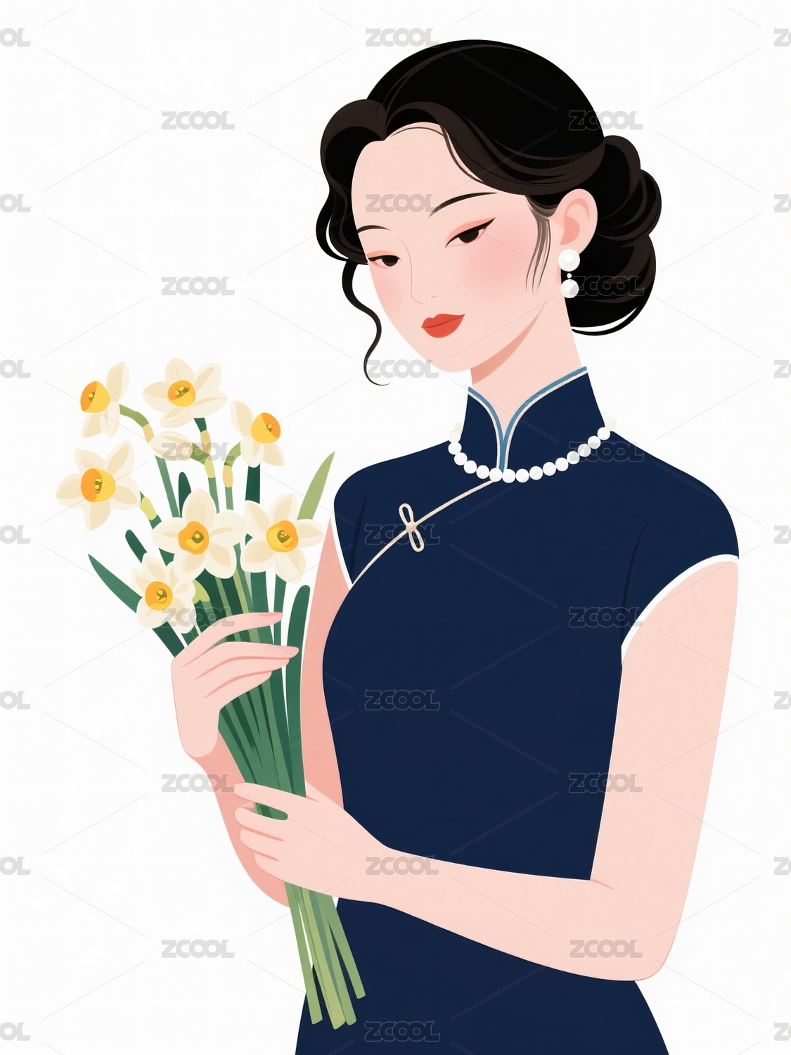 鲜花,衣服,裙子,白色,花朵,绿色,女子,粉色,珍珠,眼睛