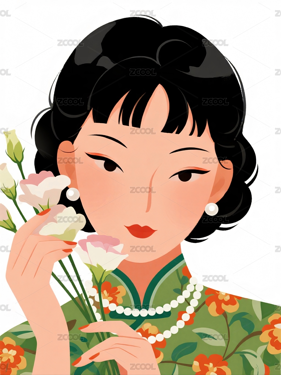 持花着旗袍的东方女子