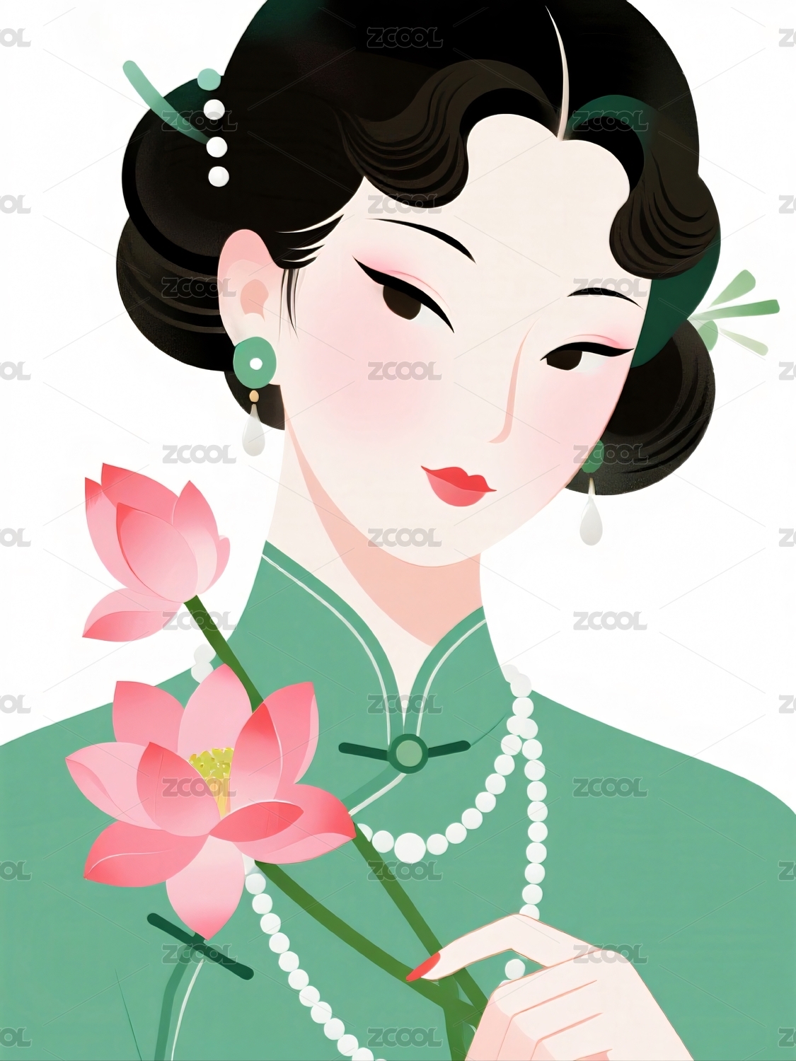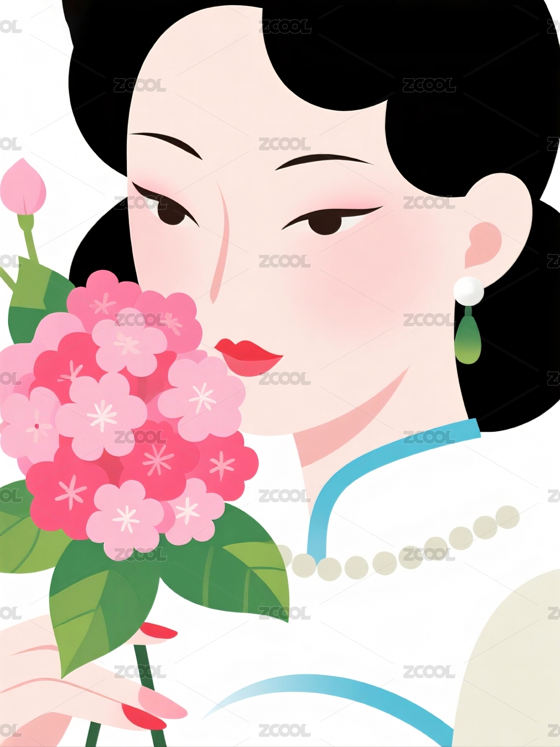 旗袍女子手持粉色牡丹