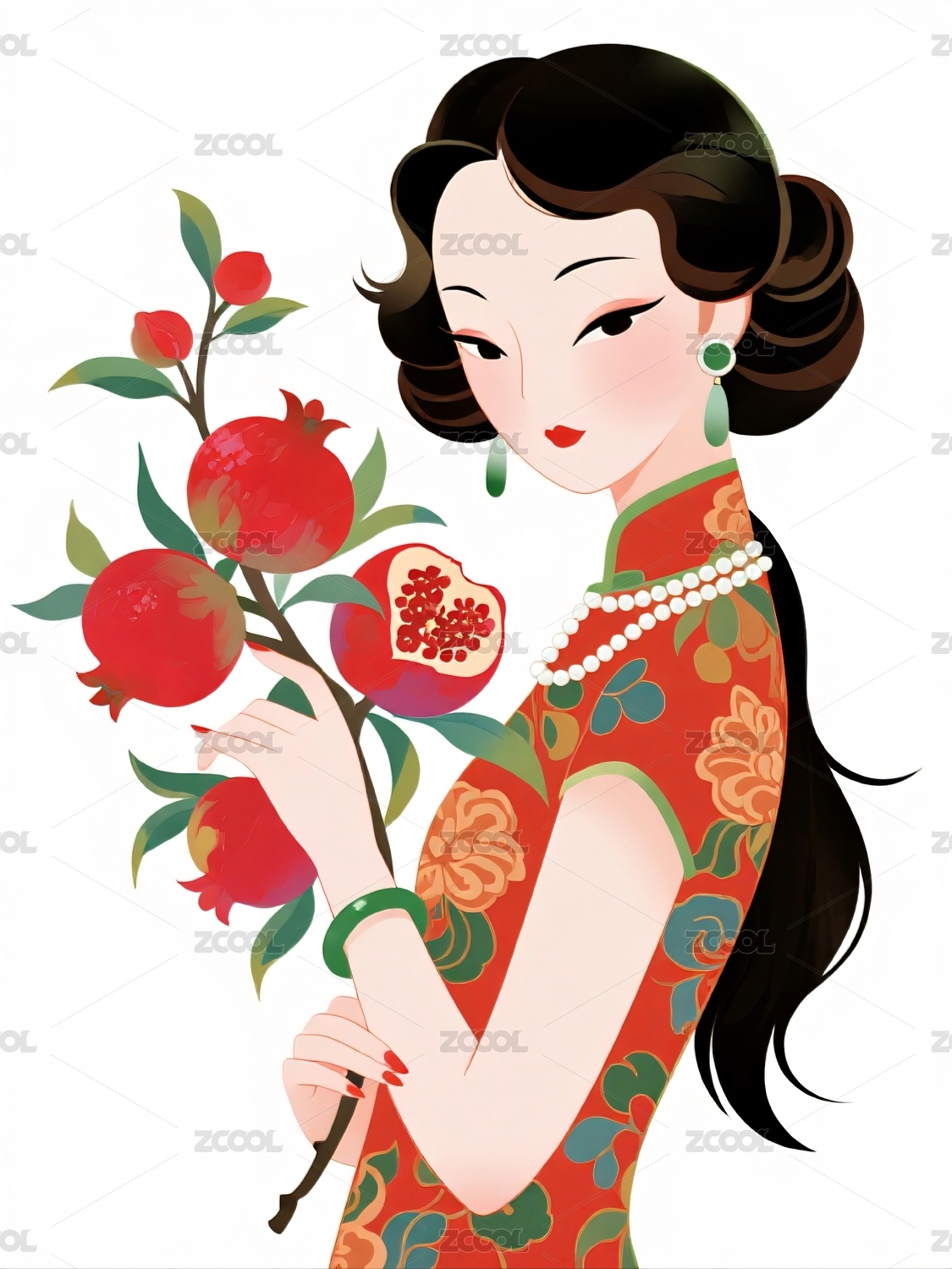 女子着旗袍手捧石榴花