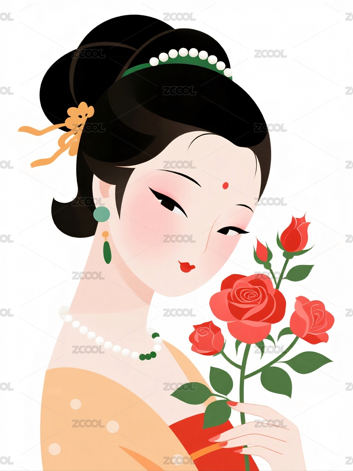 古典仕女手持红玫瑰花