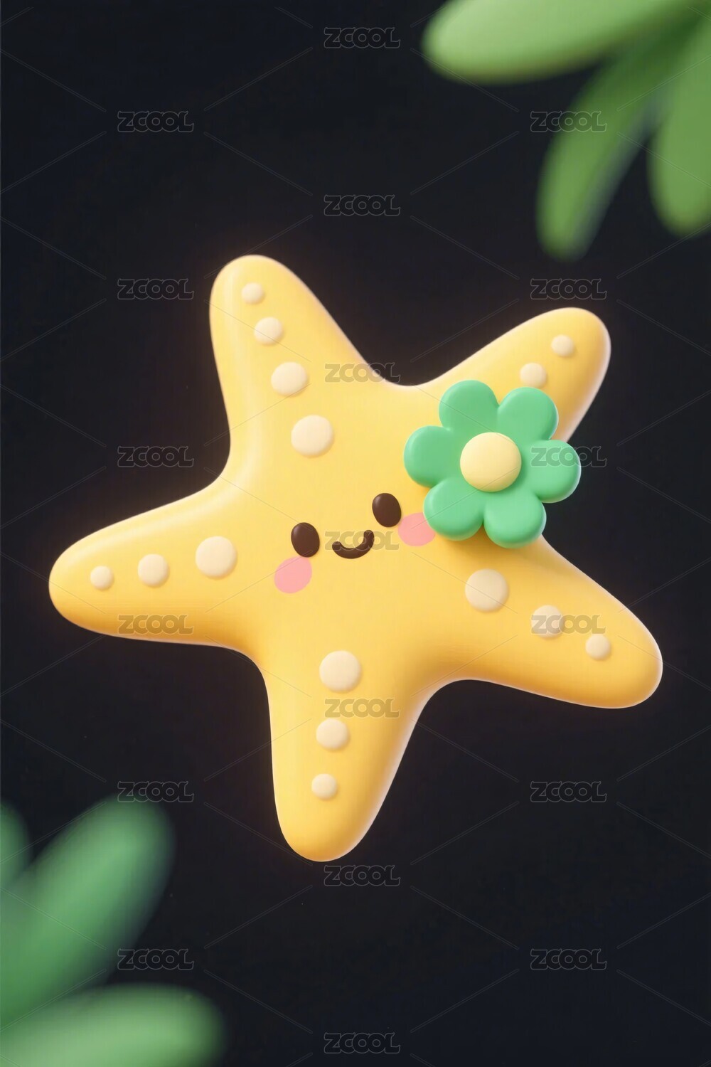 绿色卡通海星与花朵