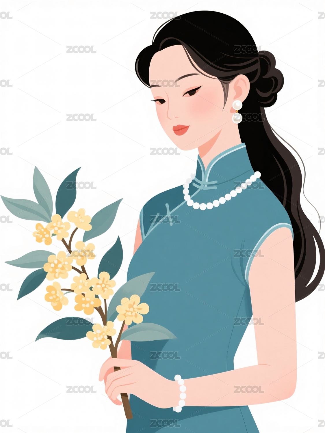 女子持花绿色旗袍珍珠项链
