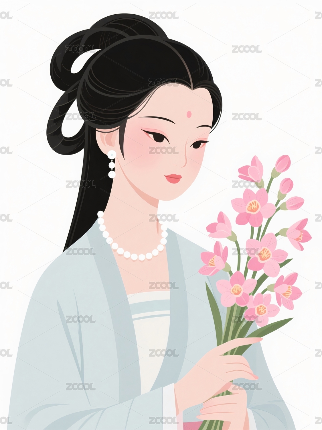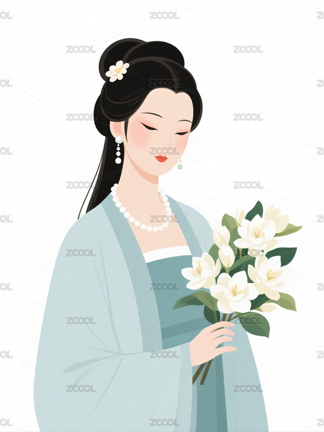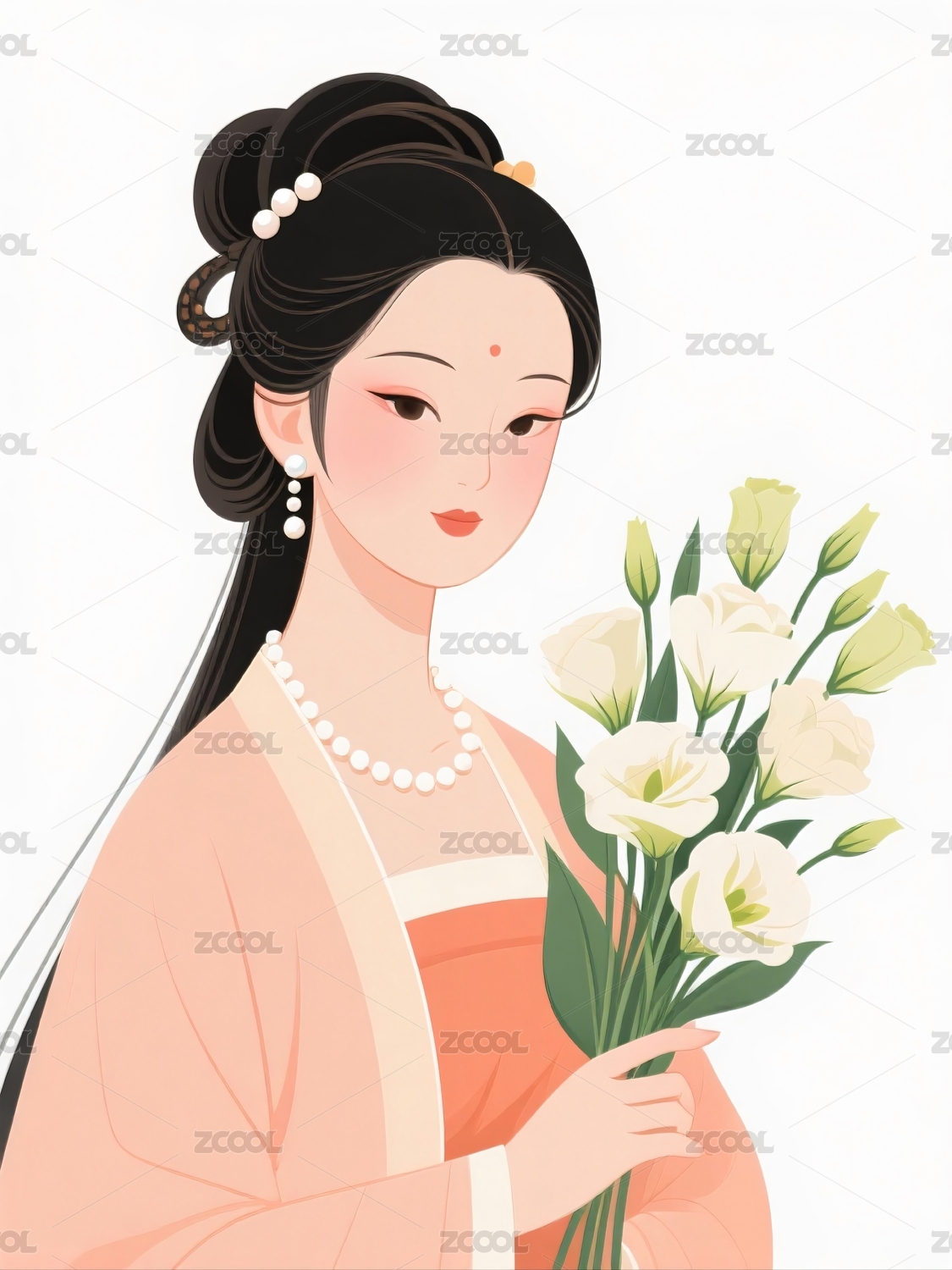 衣服,裙子,白色,绿色,站立,柔和,美丽,女子,粉色,花束