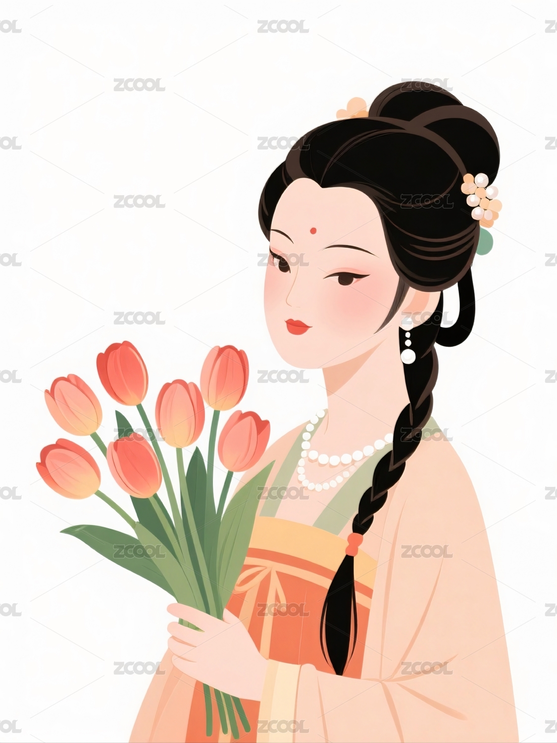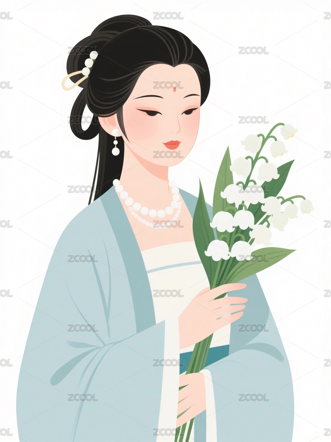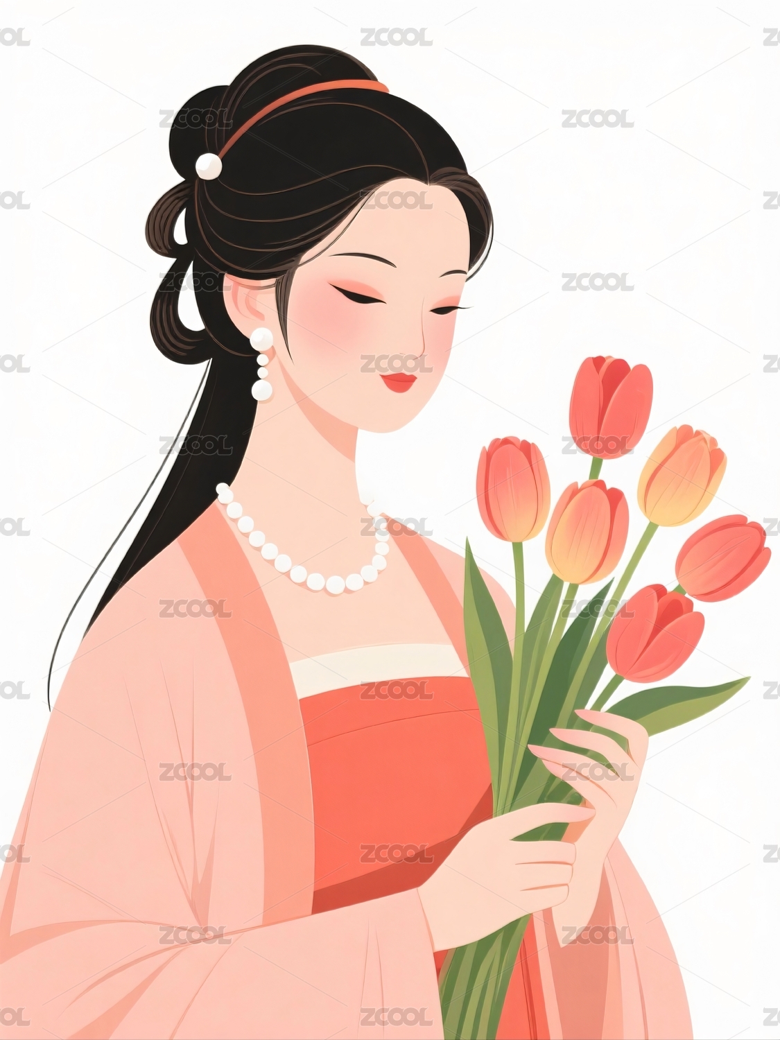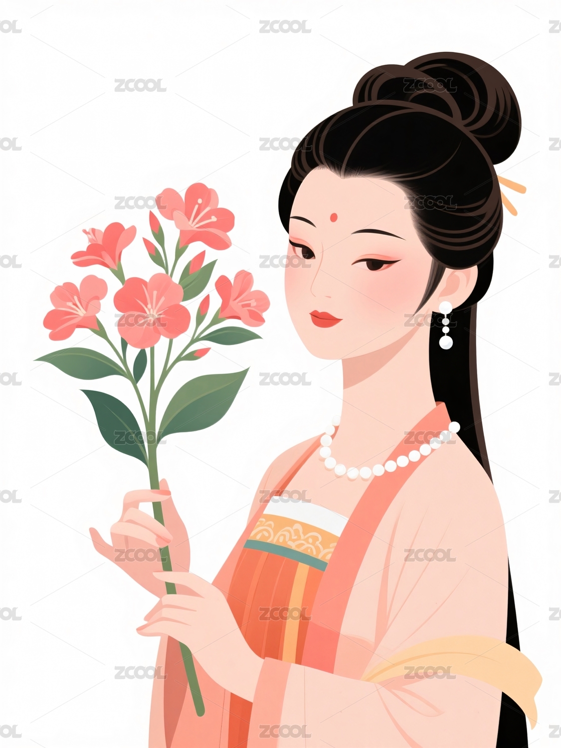 衣服,裙子,白色,绿色,站立,柔和,美丽,女子,粉色,花束