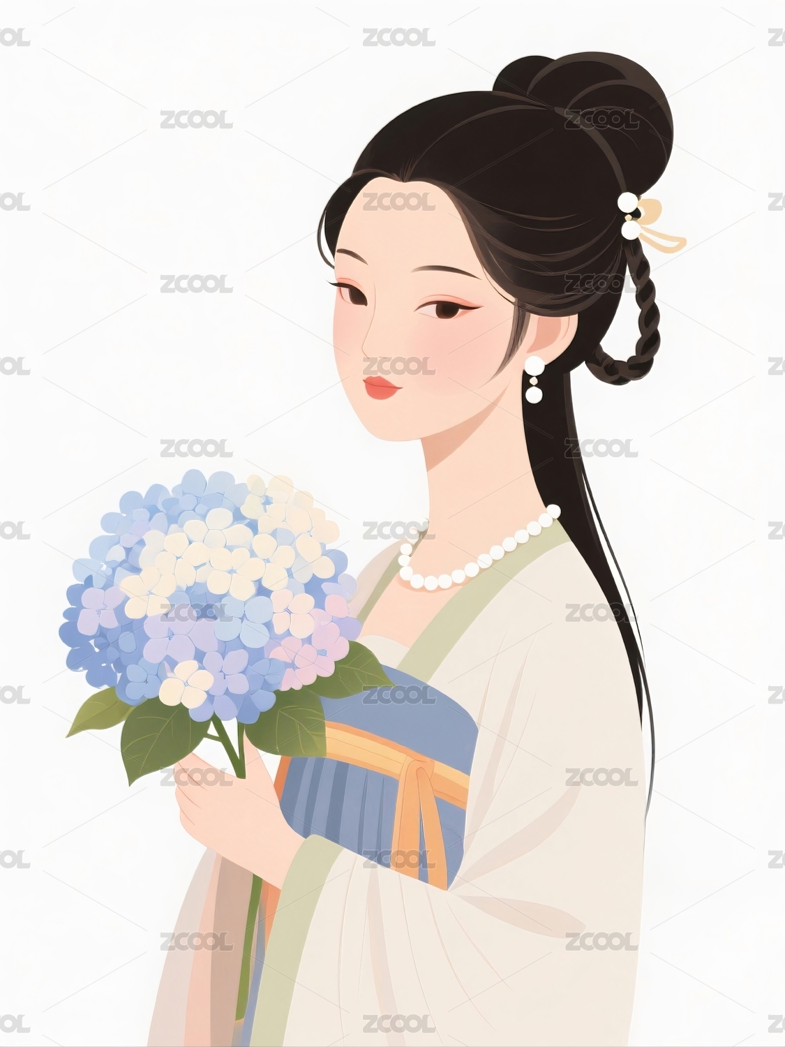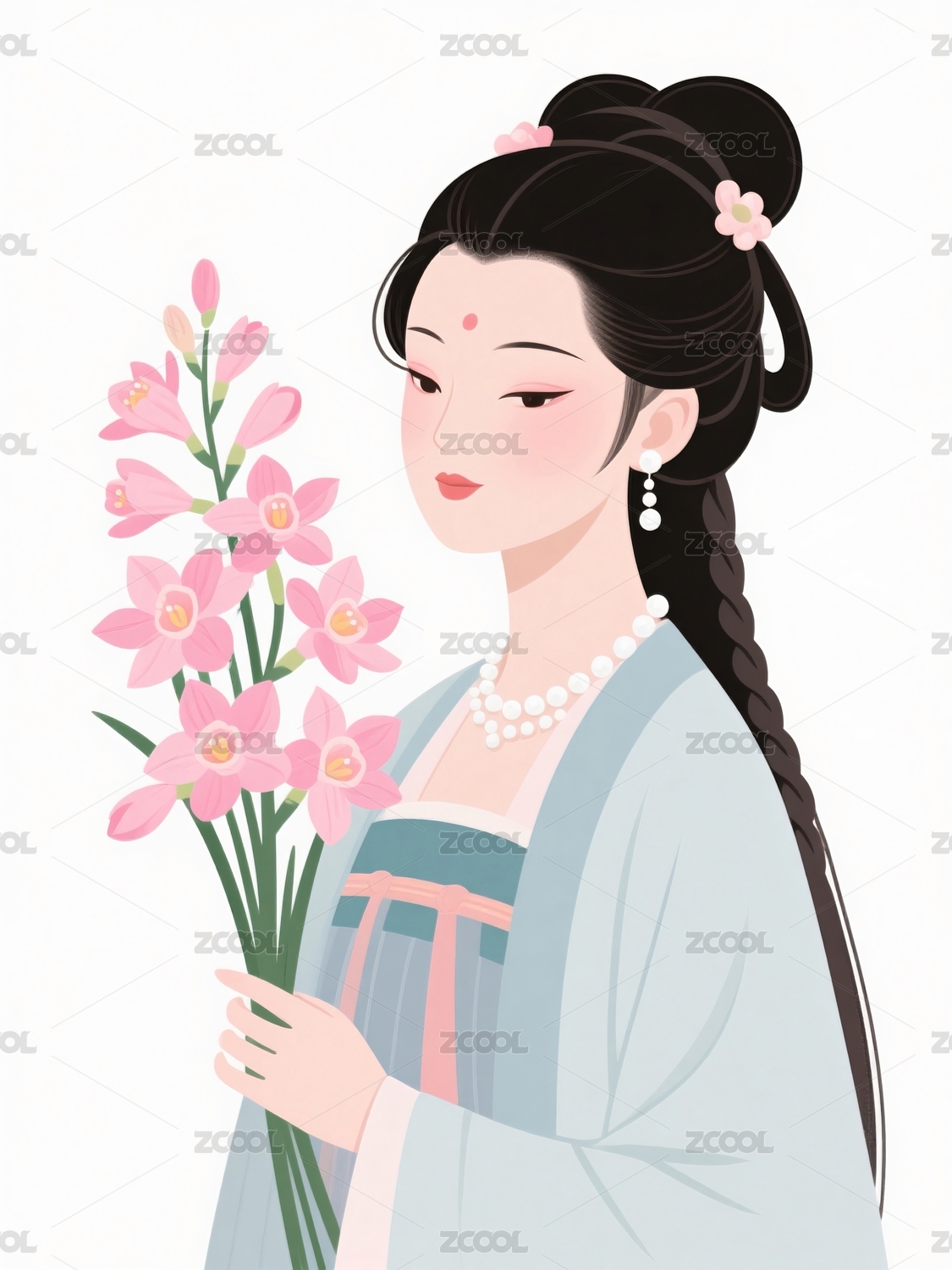 女子,珍珠,花朵,头饰,发饰,古代,长发,花束,手持,人物
