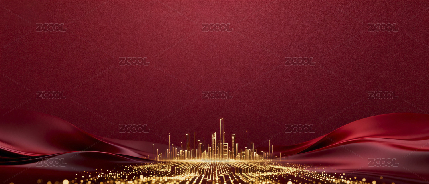 红金色绸缎布料城市建筑天际线商务庆典背景