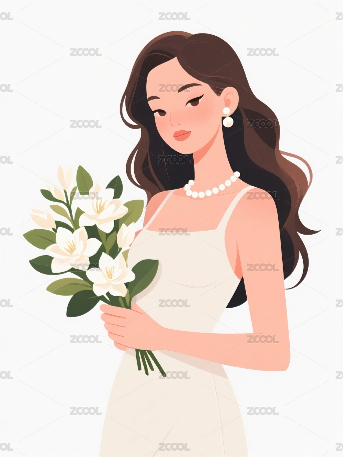 持花女子身着白色礼服