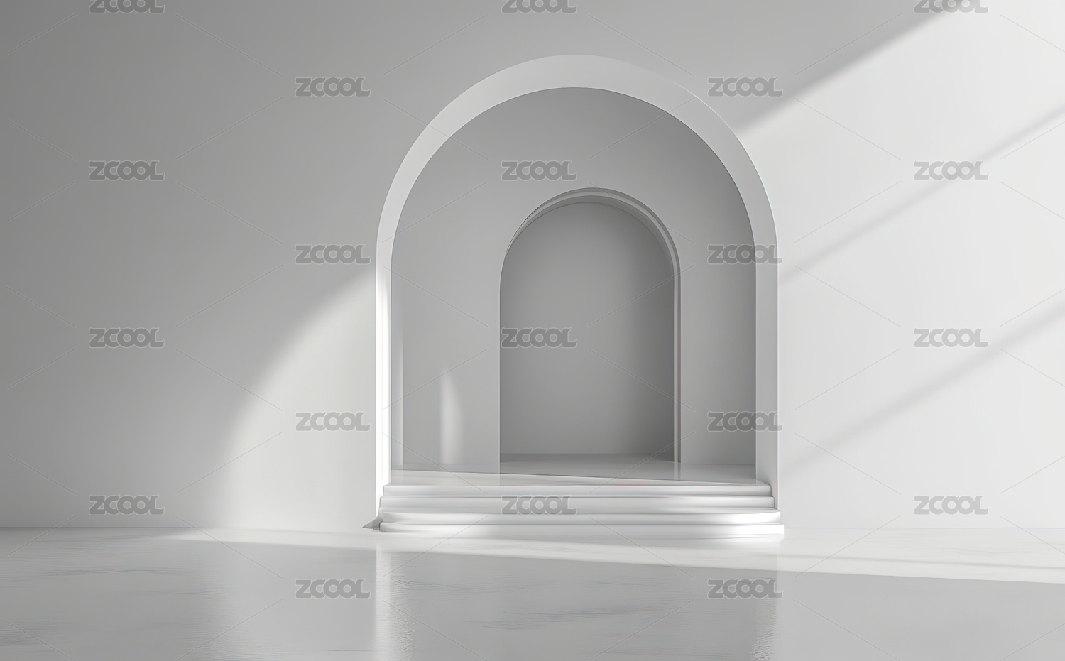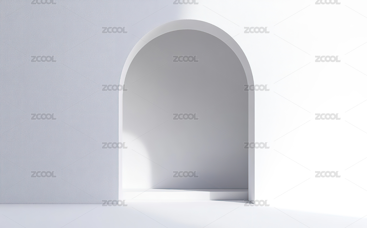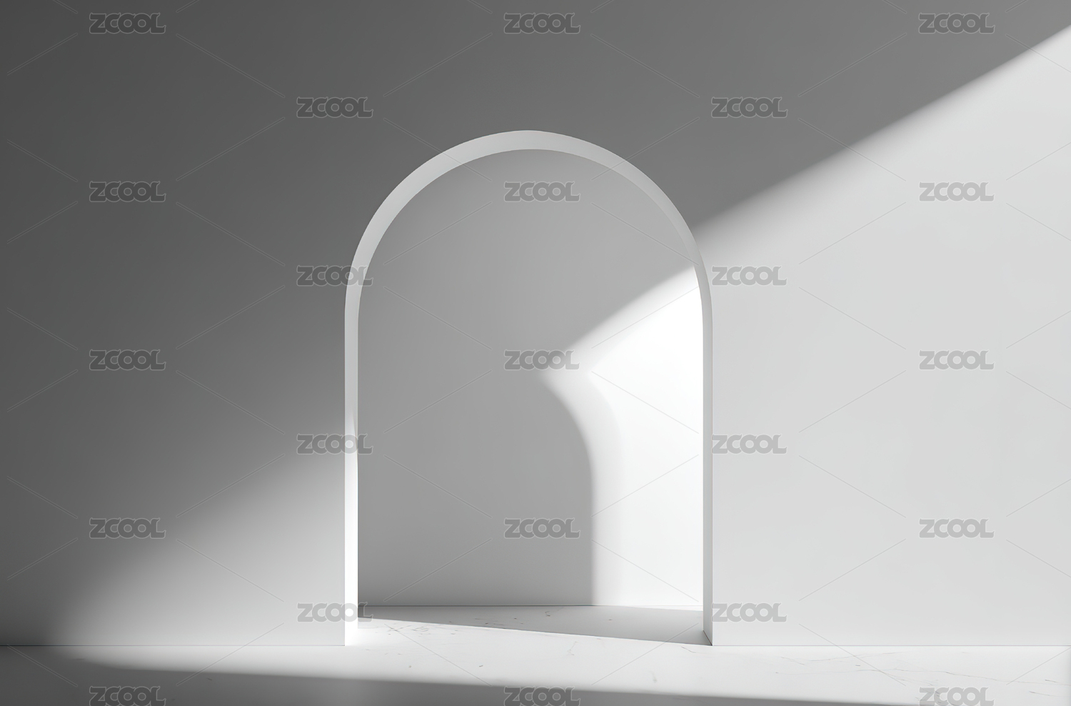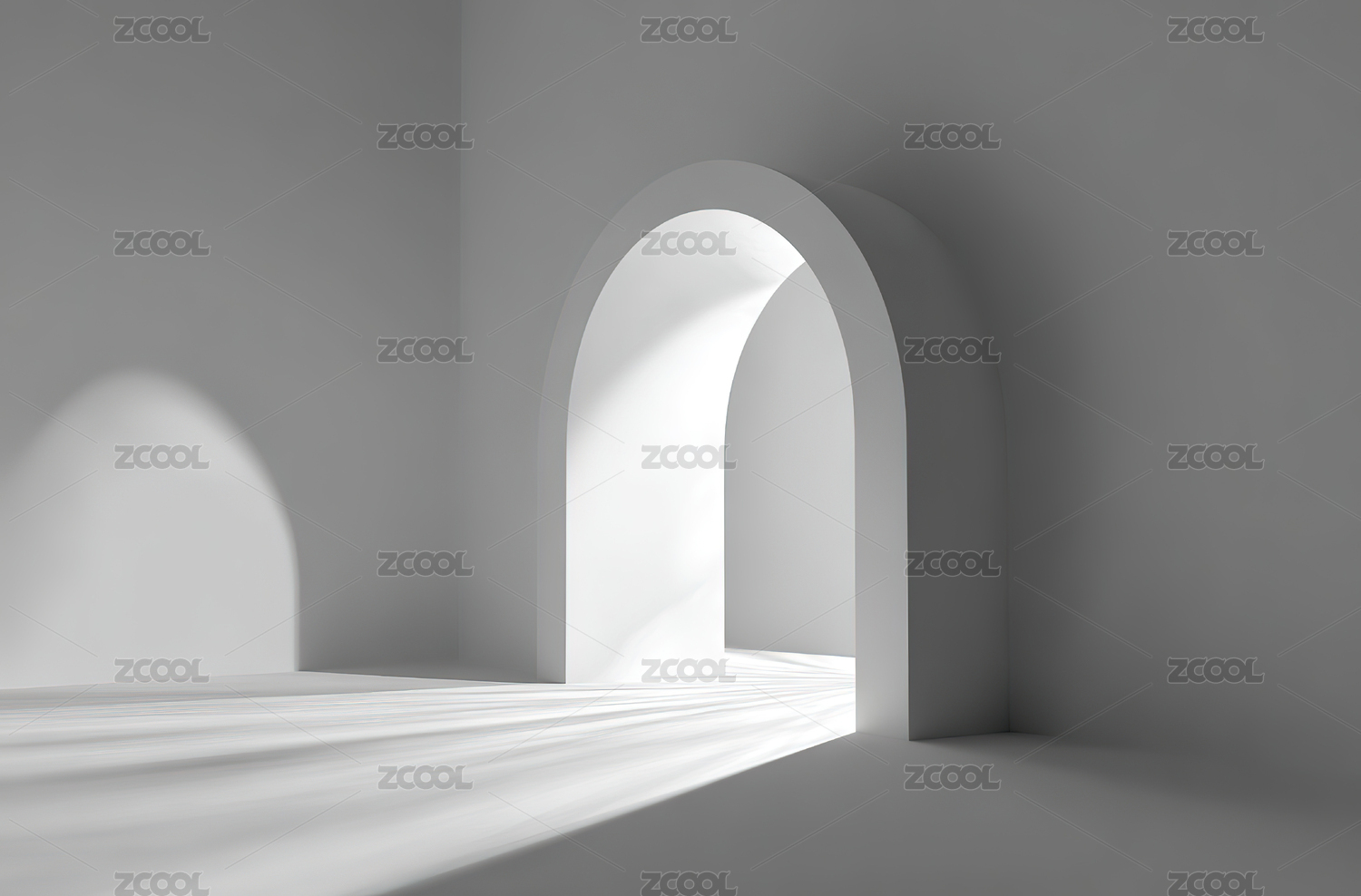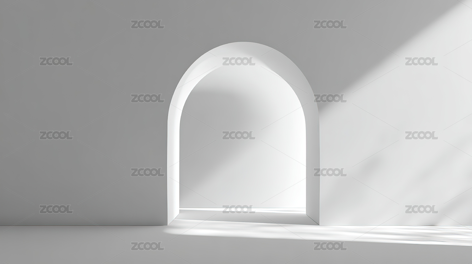 黑白极简抽象背景,中央拱形门在黑色墙上