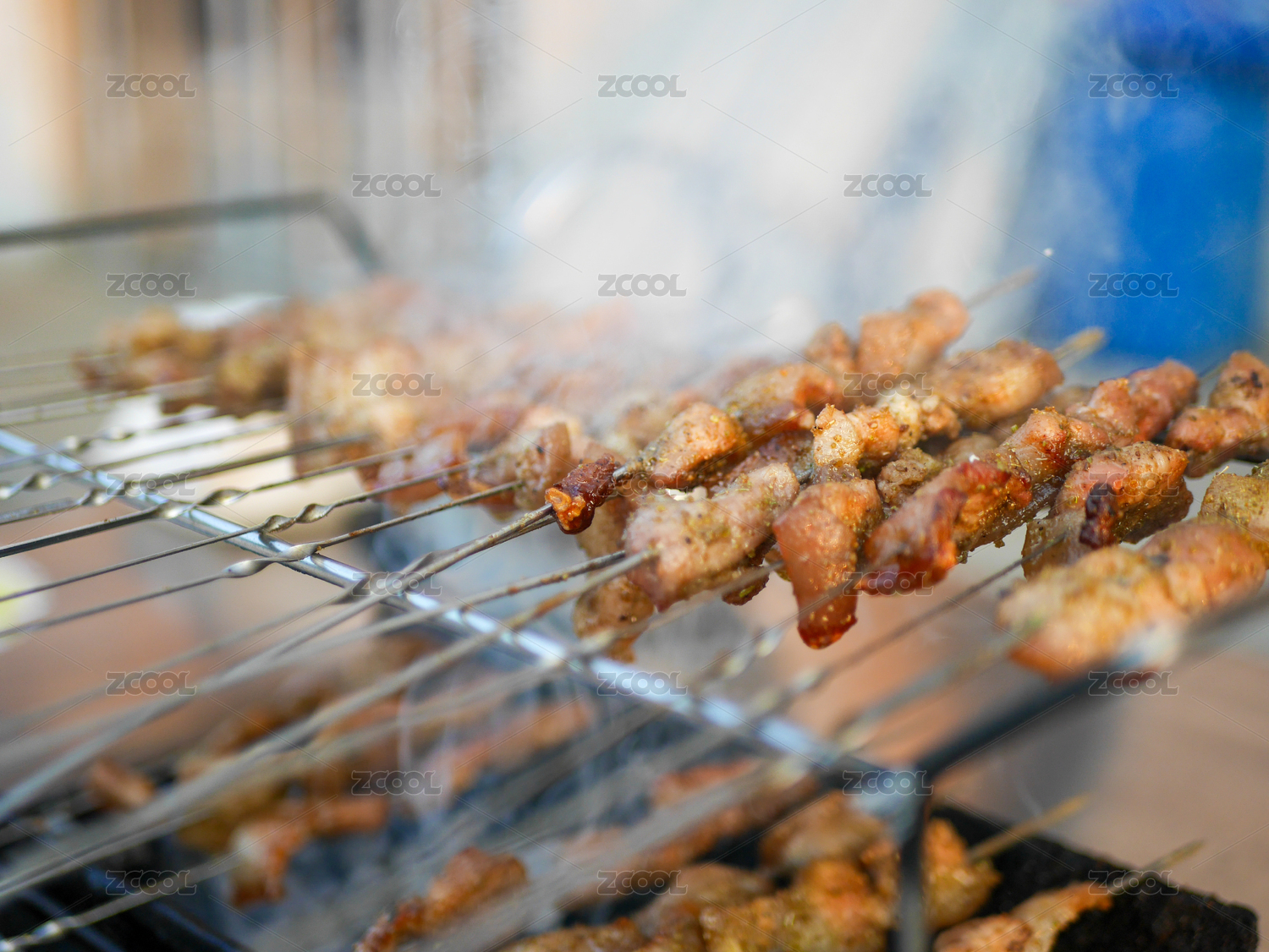 烧烤架上烤着的竹签烧烤烤串猪排骨猪肋排