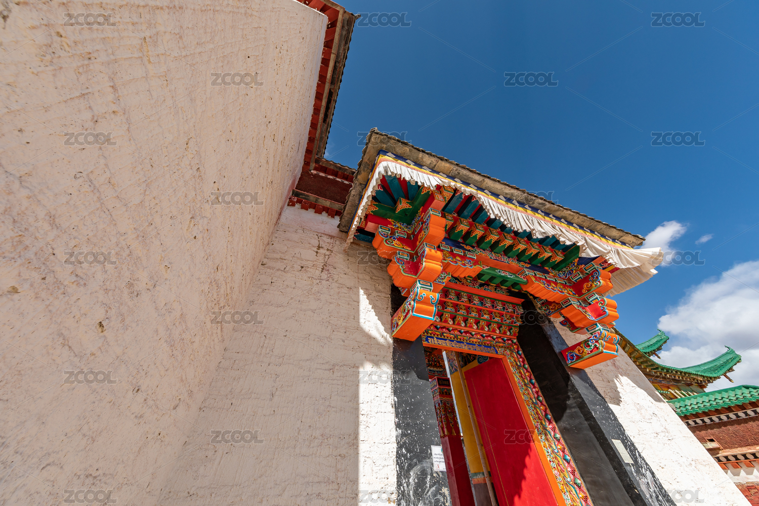 蓝天白云下的阿坝各莫寺寺院建筑