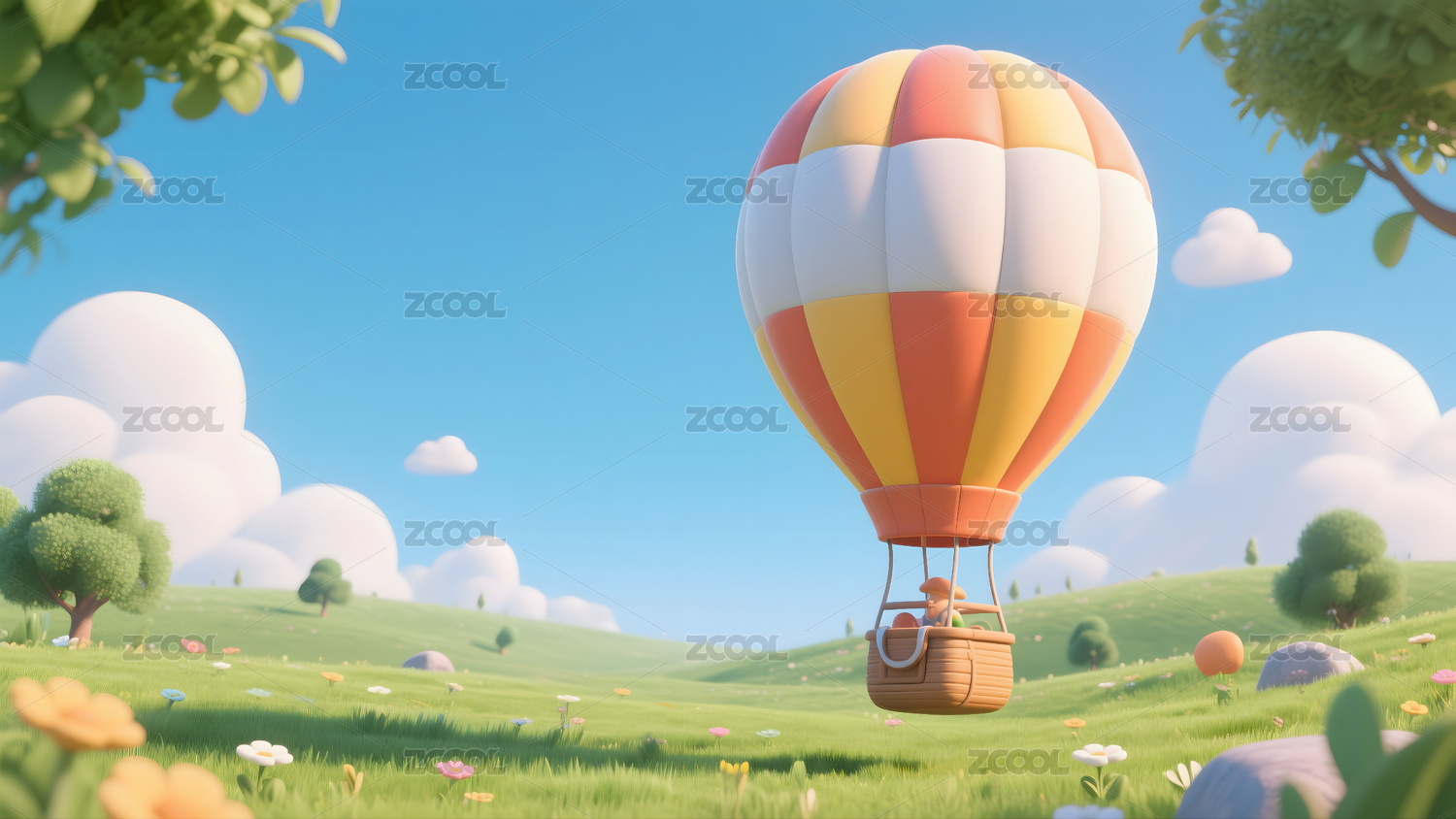 热气球,云朵,童话,梦幻,治愈,可爱,卡通,田园,花海,天空