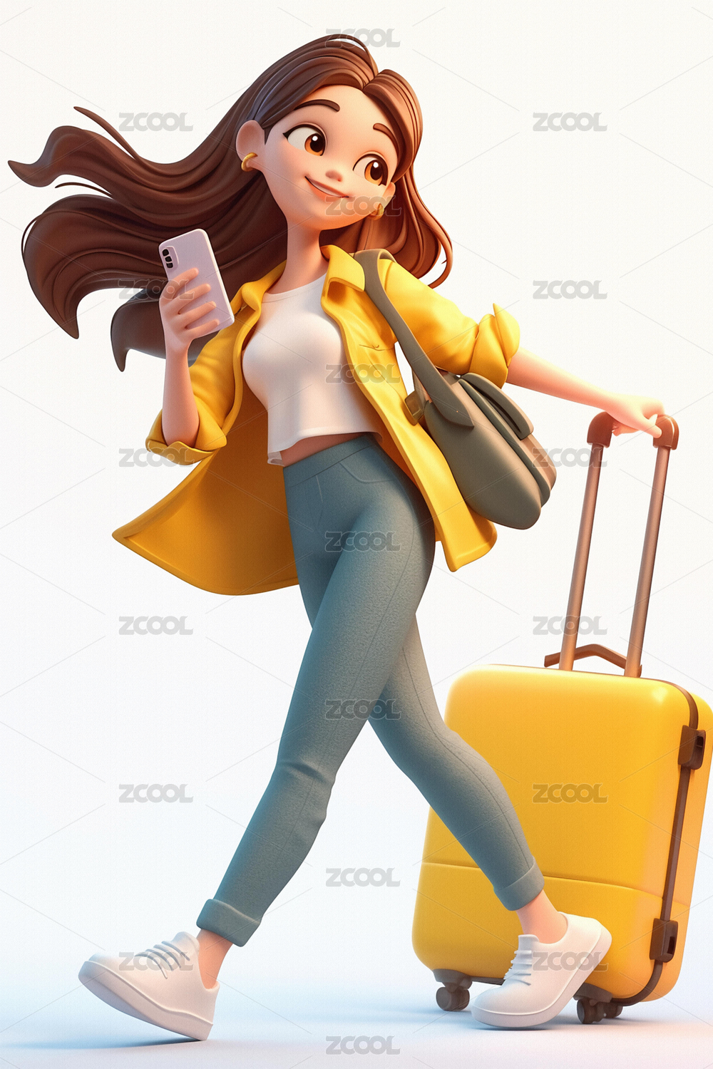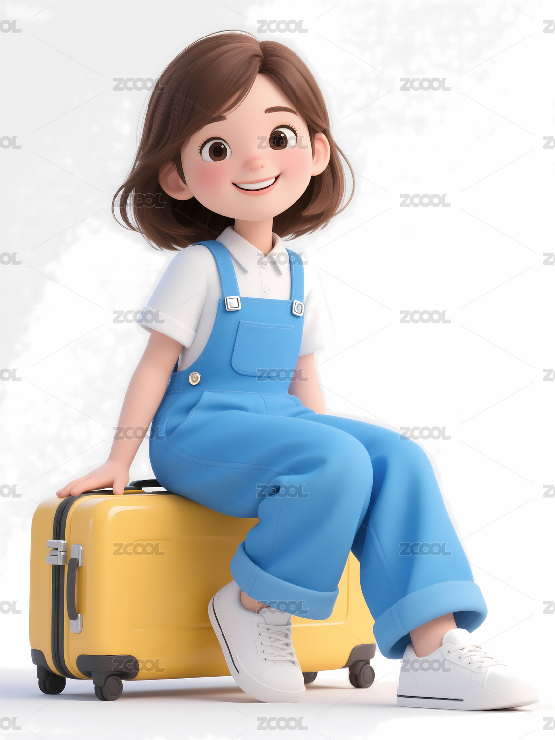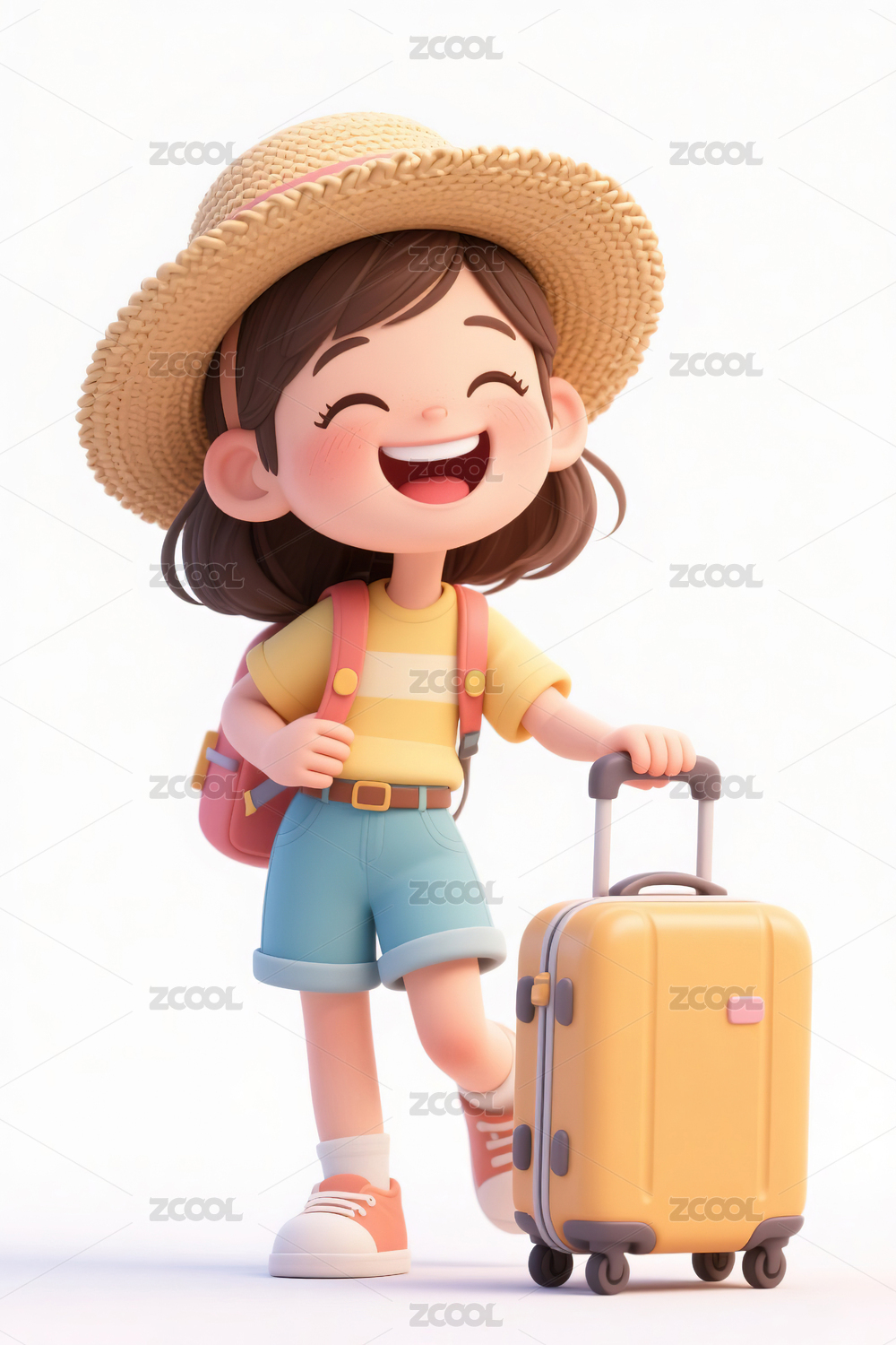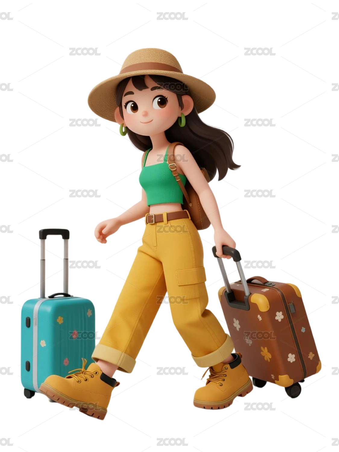 卡通,旅行,女孩,行李箱,度假,黄色,帽子,裤子,靴子,手提包
