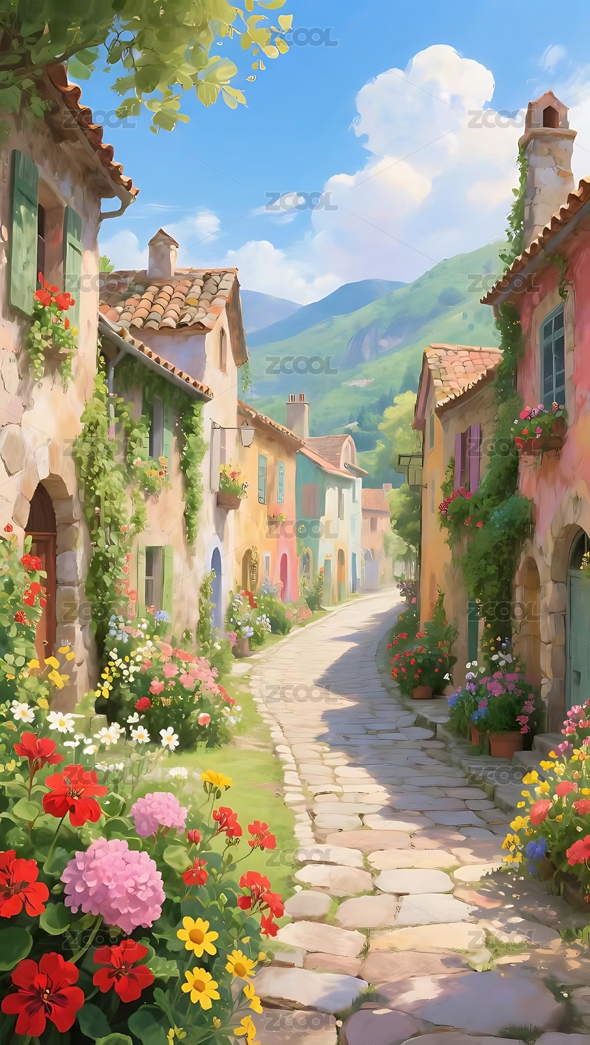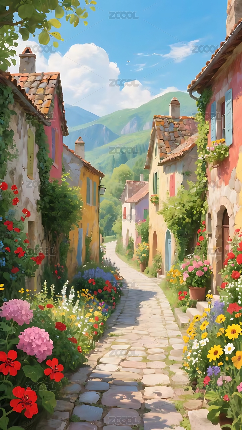 欧式小镇鲜花街巷风景