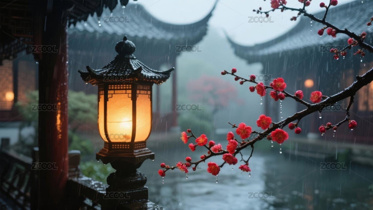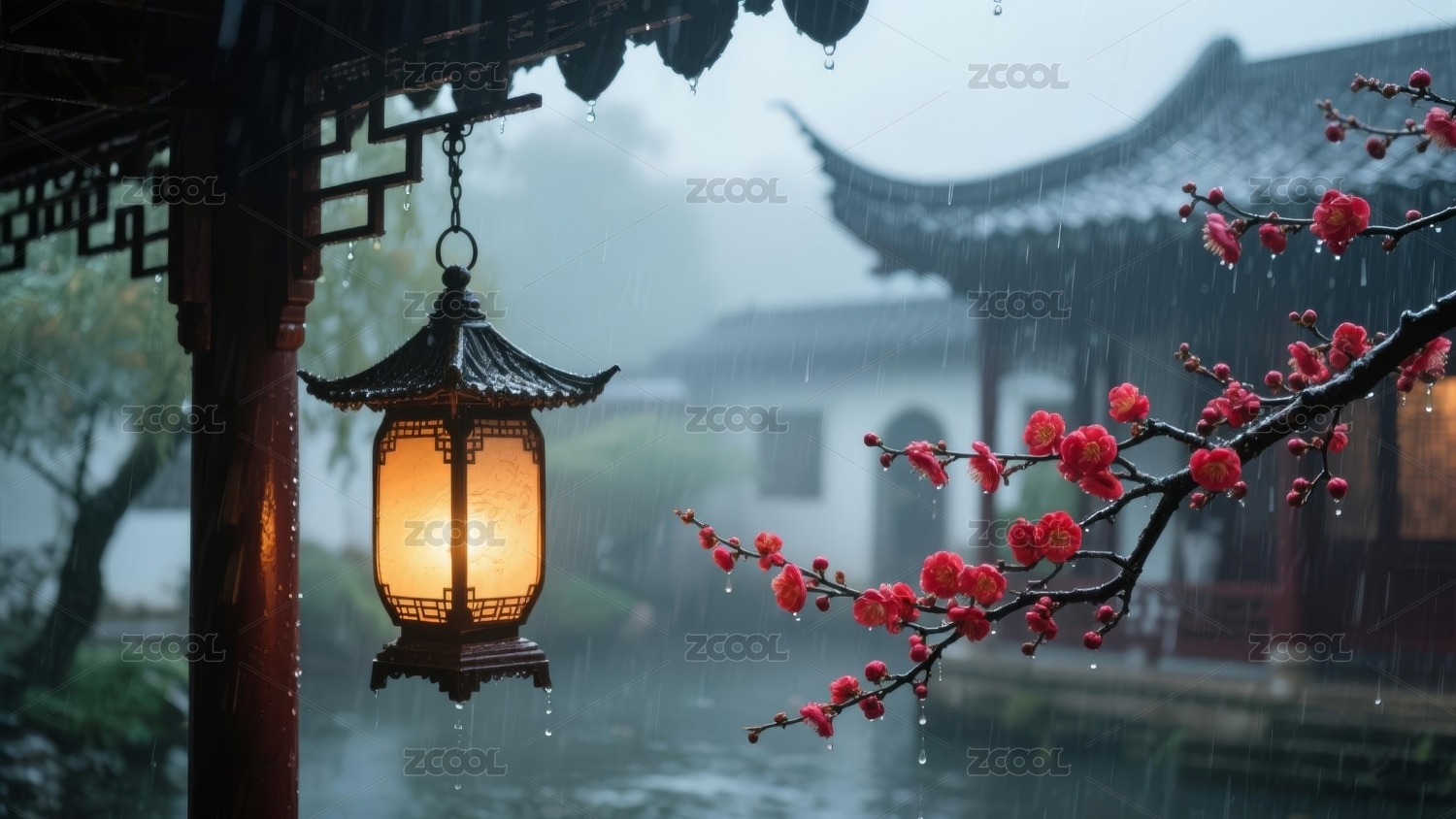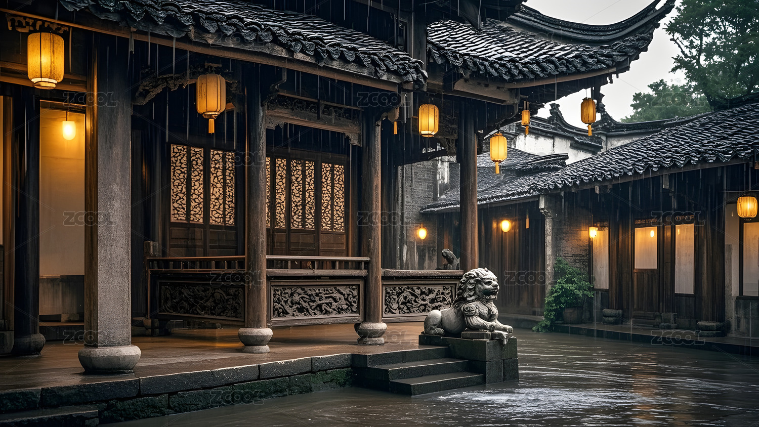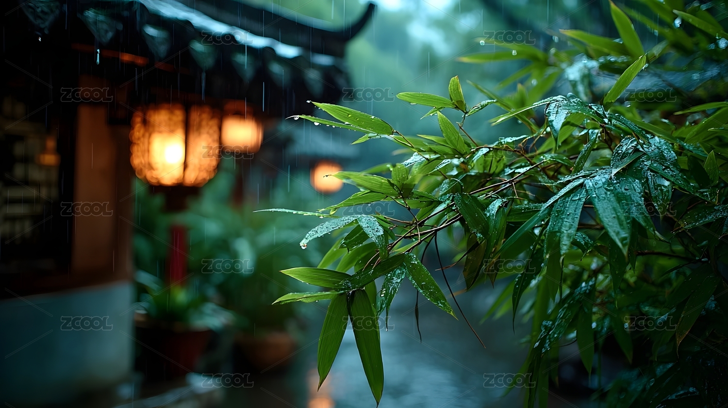 江南,雨景,古镇,水乡,朦胧,意境,诗意,建筑,灯笼,竹林