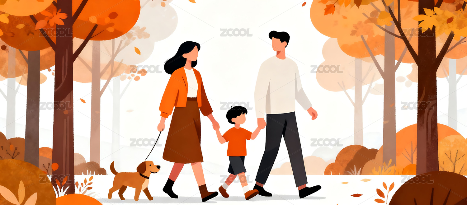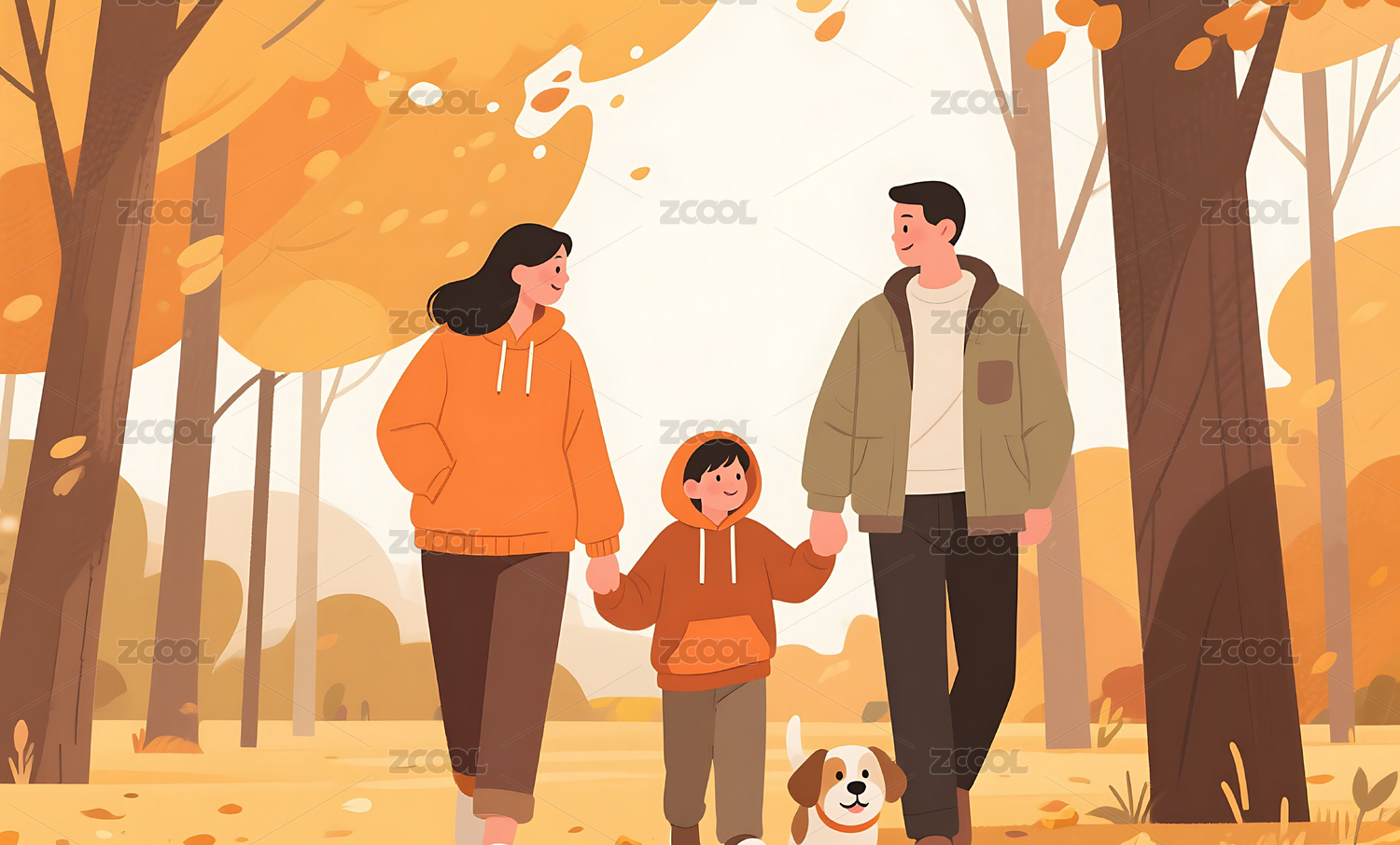 家庭,父母,孩子,秋天,落叶,插画,欢乐,温馨,户外,人物