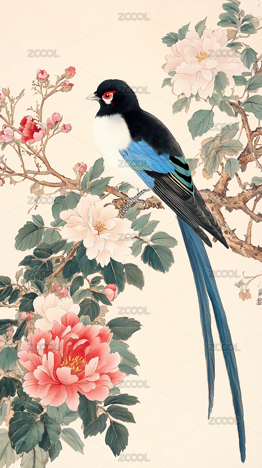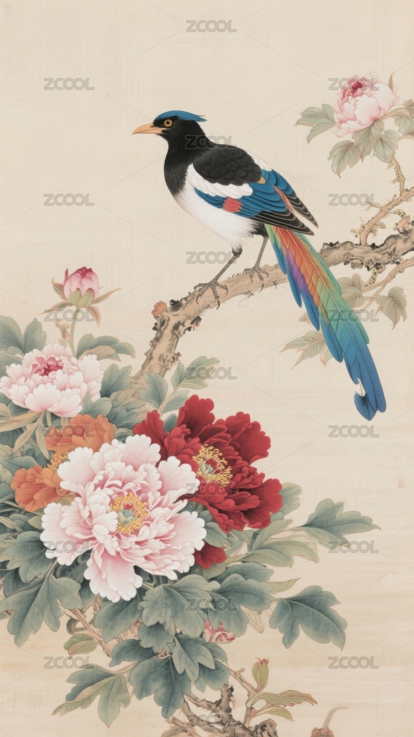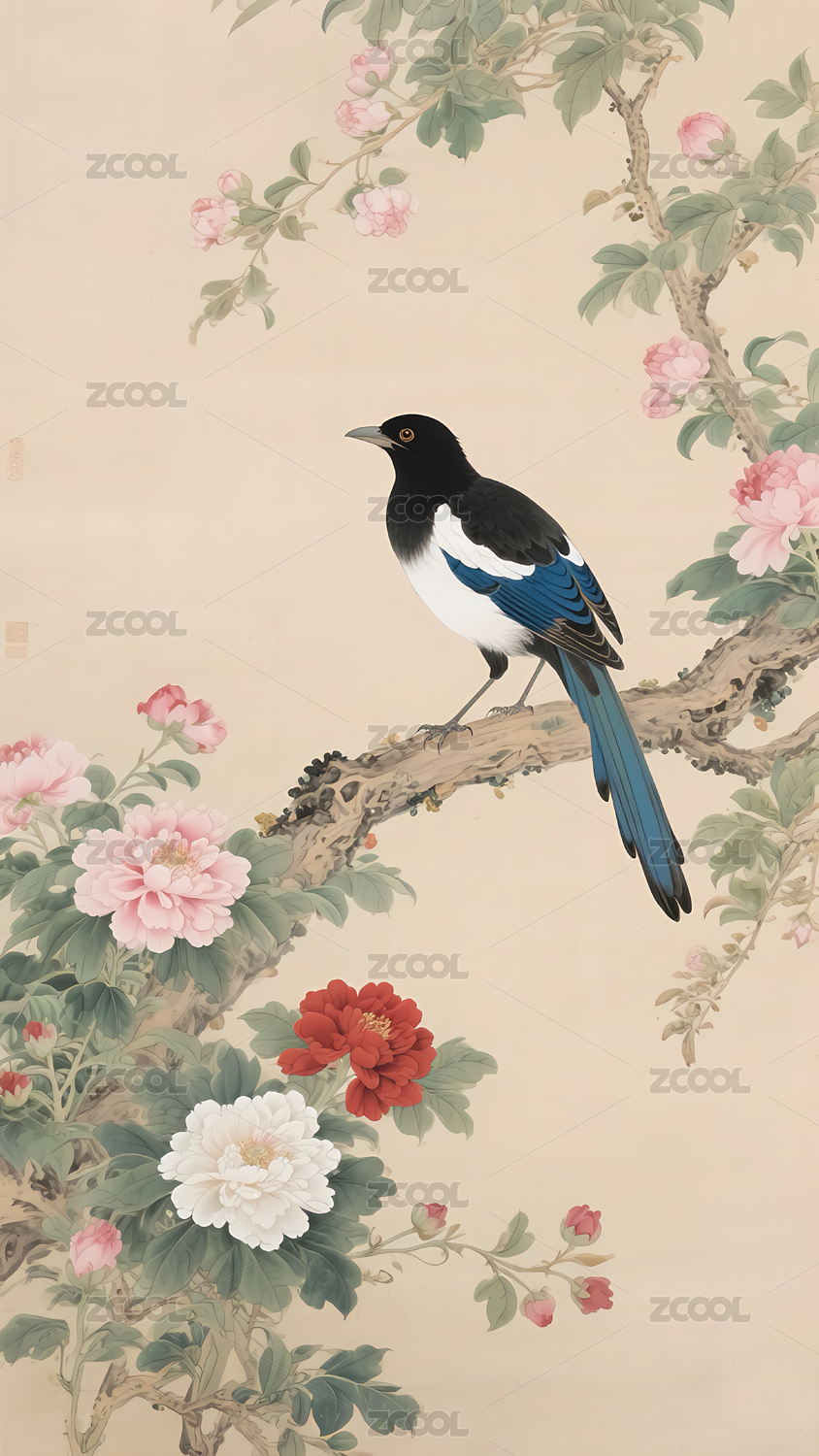 一只鸟站在枝桠上工笔画国画古典植物艺术