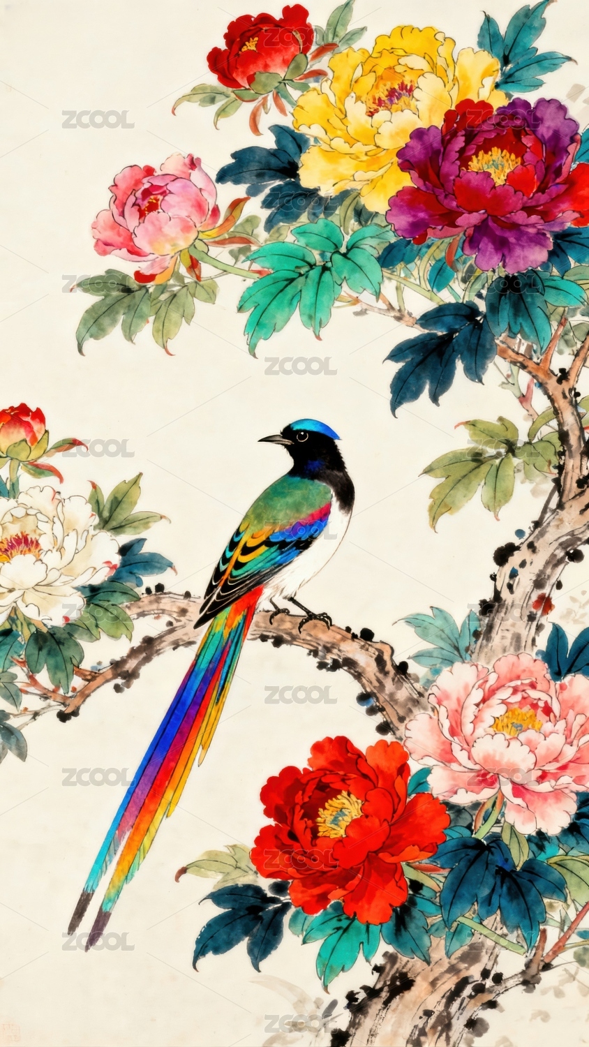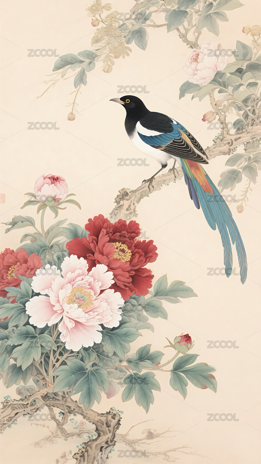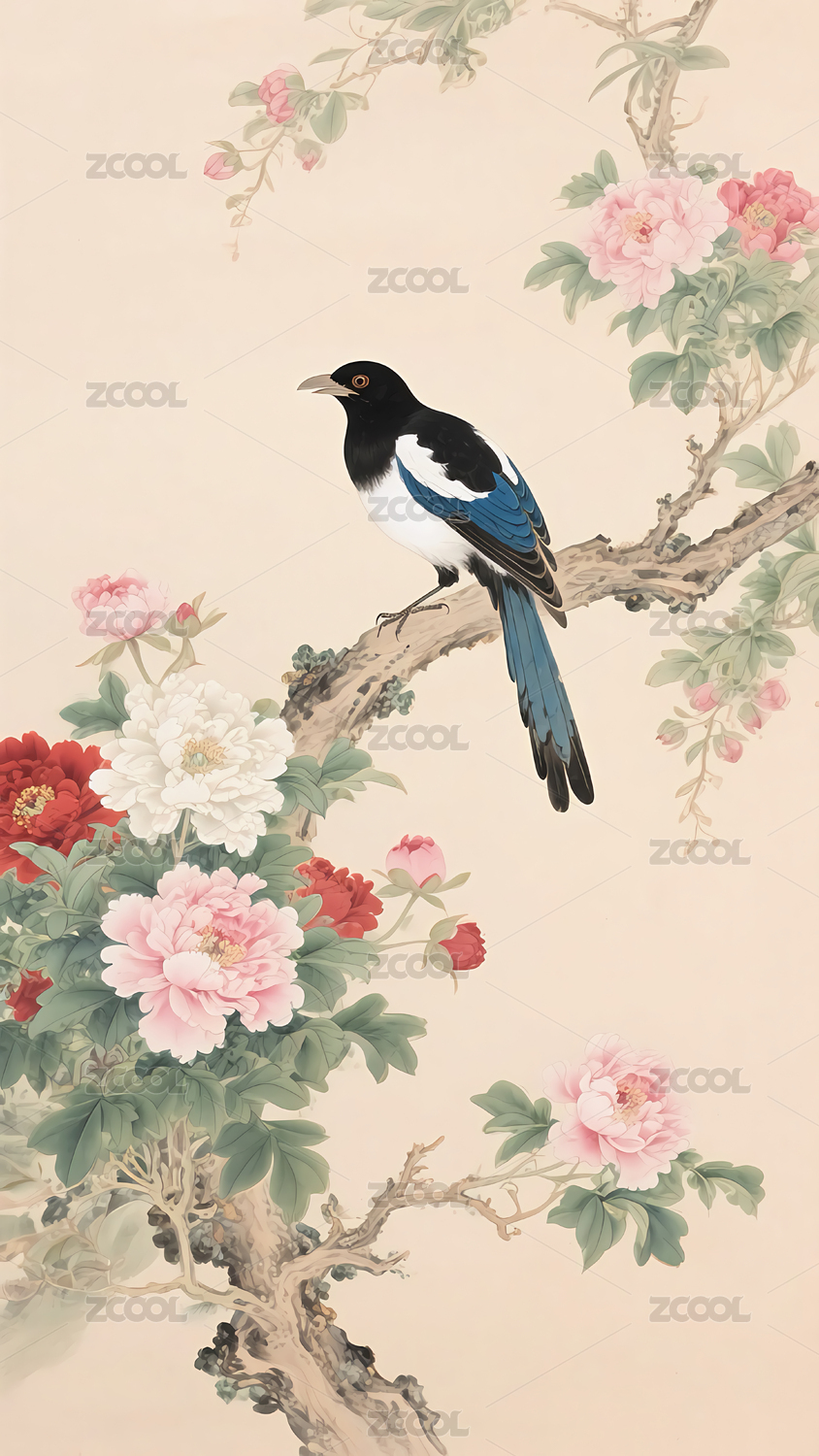 一只鸟站在枝桠上工笔画国画古典植物艺术