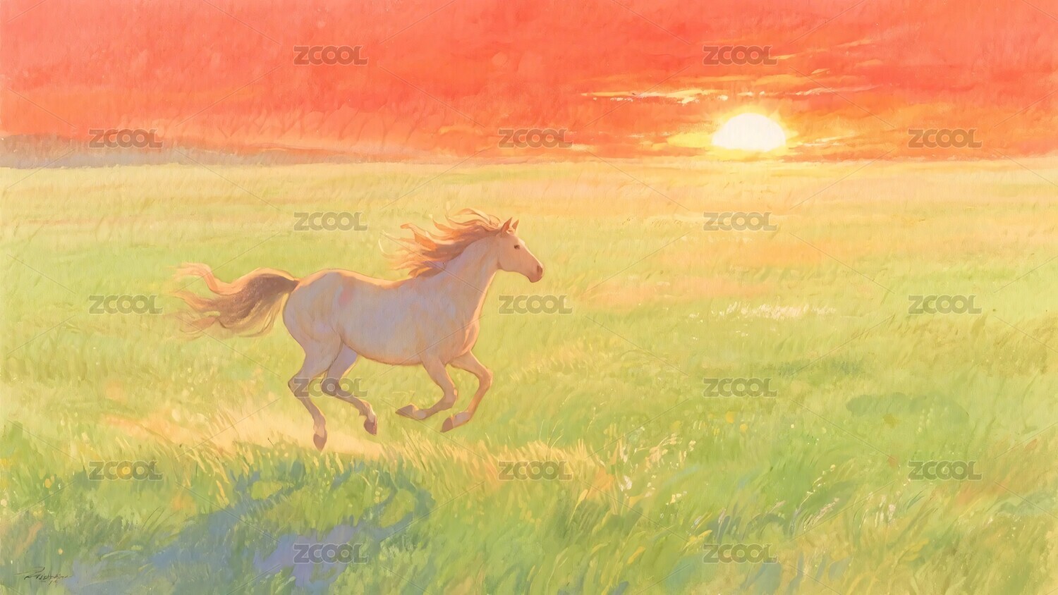 草原奔马日落图