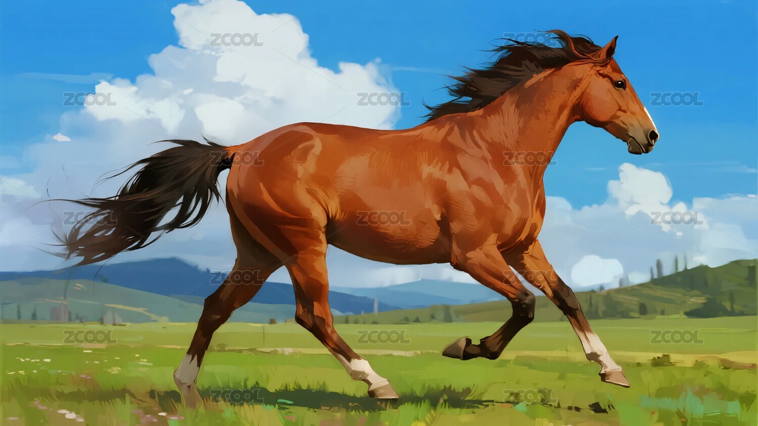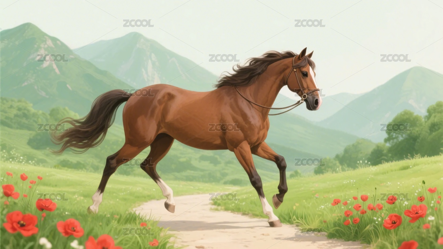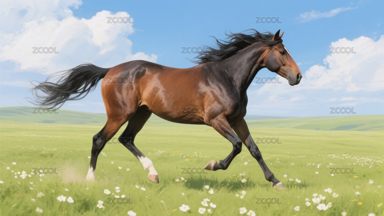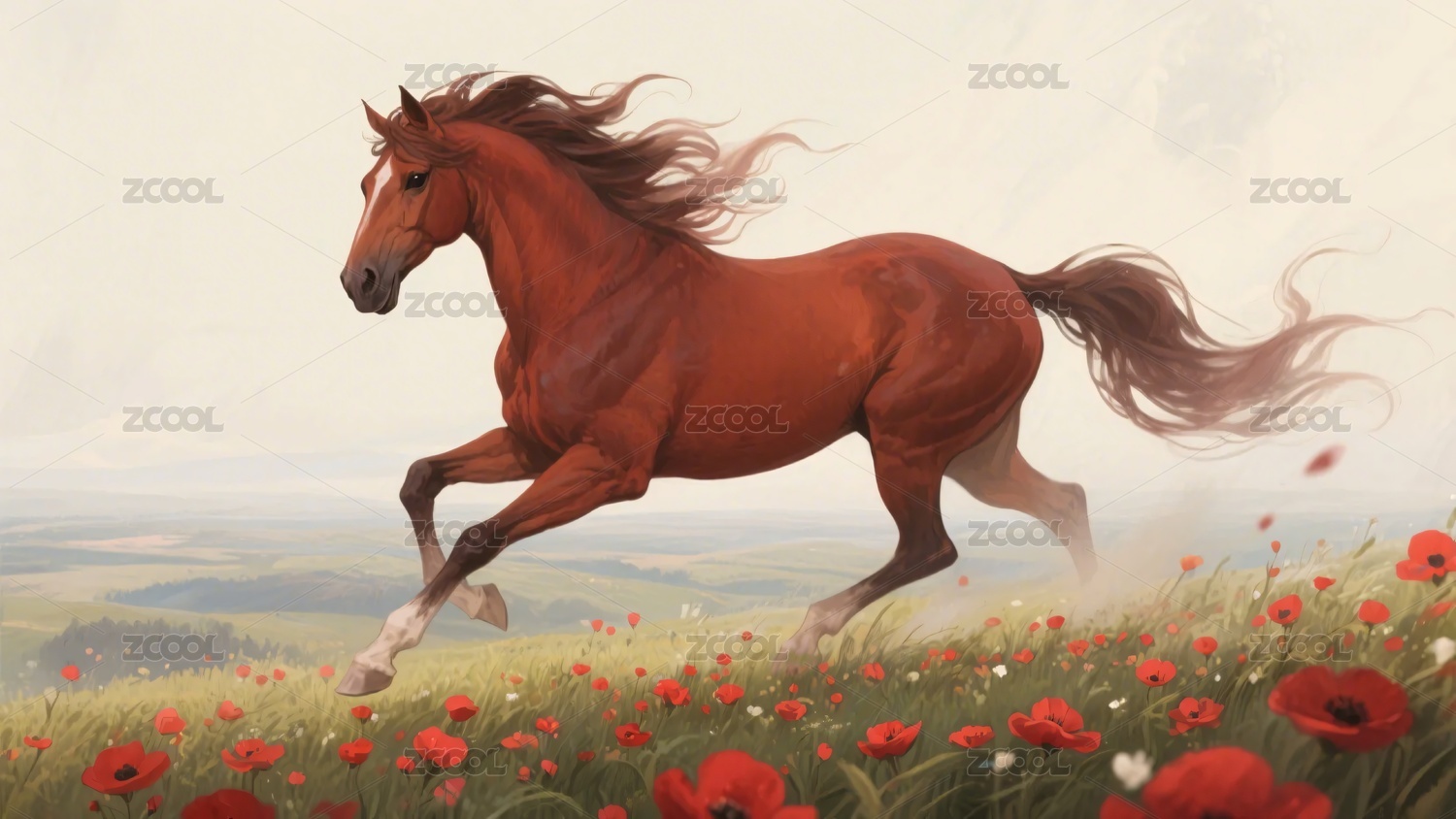 骏马,草原,山丘,花朵,自然,风景,插画,矢量,动物,奔跑