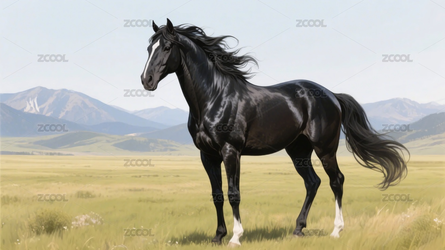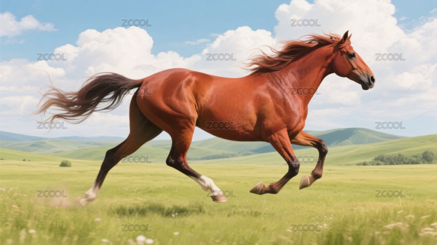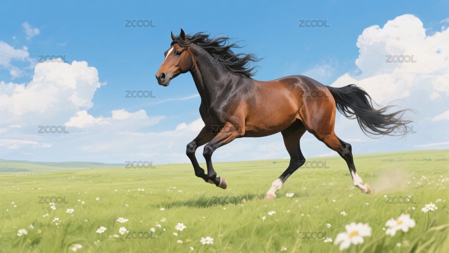 骏马,草原,山丘,花朵,自然,风景,插画,矢量,动物,奔跑